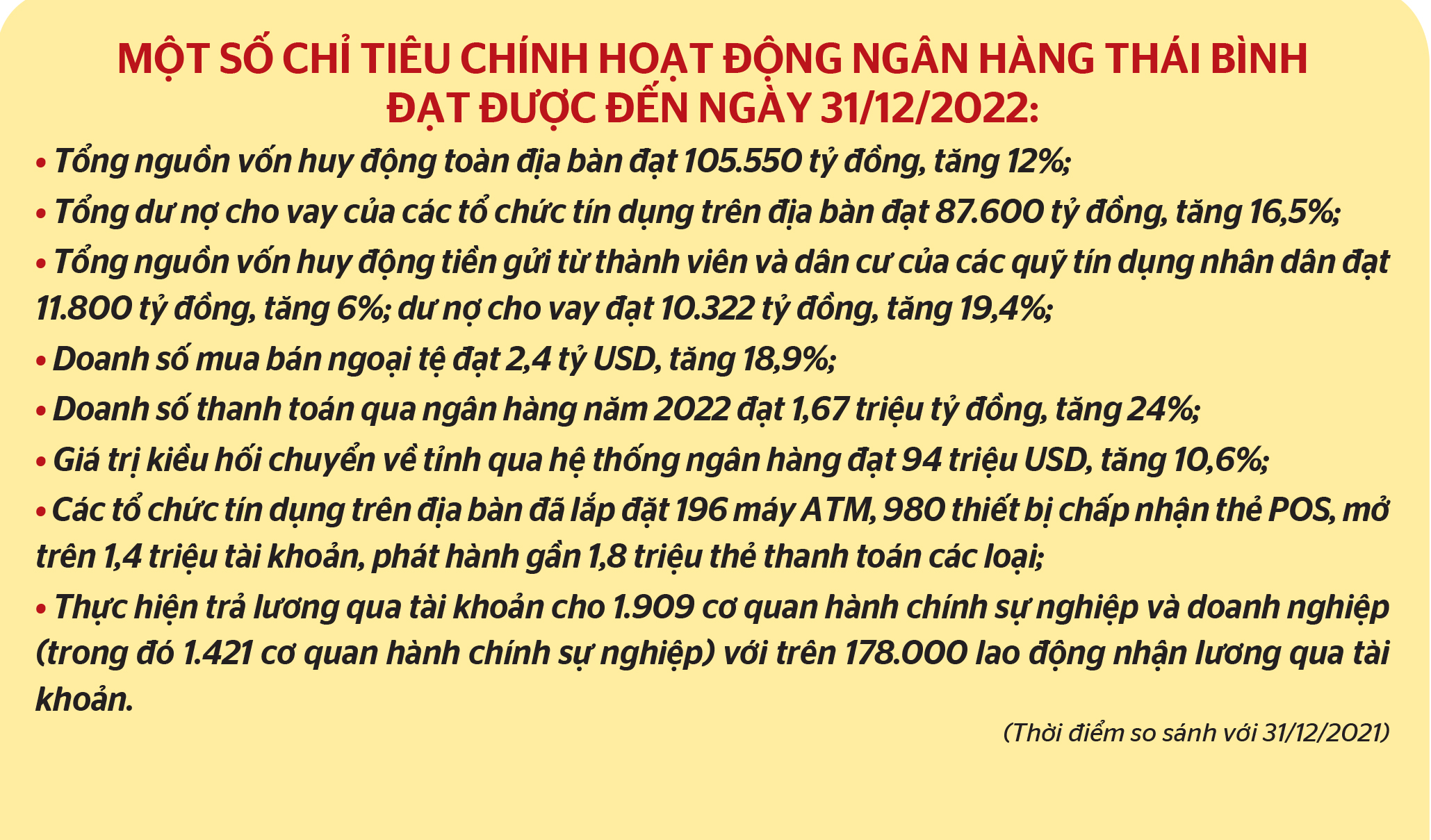Trong bối cảnh đó, ngành ngân hàng Thái Bình đã chủ động triển khai kịp thời, hiệu quả các chủ trương, chính sách, văn bản chỉ đạo của Chính phủ, của Ngân hàng Nhà nước (NHNN) Việt Nam và của tỉnh, tham gia thực hiện tốt đồng thời 2 nhiệm vụ: vừa kiểm soát lạm phát, ổn định kinh tế vĩ mô, vừa cung cấp vốn tín dụng, dịch vụ ngân hàng để hỗ trợ phục hồi và phát triển nền kinh tế, đóng góp tích cực vào phát triển kinh tế - xã hội của tỉnh.