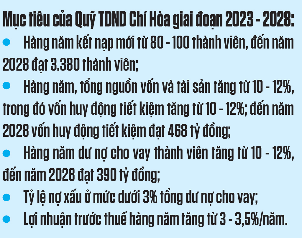Triển khai có hiệu quả các giải pháp, đến hết tháng 3/2023, tổng dư nợ cho vay của Quỹ TDND Chí Hòa đạt 260 tỷ đồng, tăng 92,2% so với thời điểm 31/12/2017, bình quân tăng 18,44%/năm; trong đó cho vay sản xuất nông nghiệp chiếm 23%, cho vay kinh doanh dịch vụ và ngành nghề chiếm 45% và cho vay phục vụ đời sống chiếm 32%. Thời gian tới, Quỹ TDND Chí Hòa tiếp tục củng cố, nâng cao uy tín, vị thế trên địa bàn; tăng cường tuyên truyền về hoạt động của Quỹ, tạo dựng và giữ vững lòng tin của nhân dân địa phương đối với Quỹ; tiếp tục bám sát định hướng, mục tiêu phát triển kinh tế - xã hội của các địa phương để cho vay thành viên; tạo mọi điều kiện thuận lợi trong công tác bồi dưỡng, tập huấn nhằm nâng cao trình độ cho đội ngũ cán bộ, nhân viên...