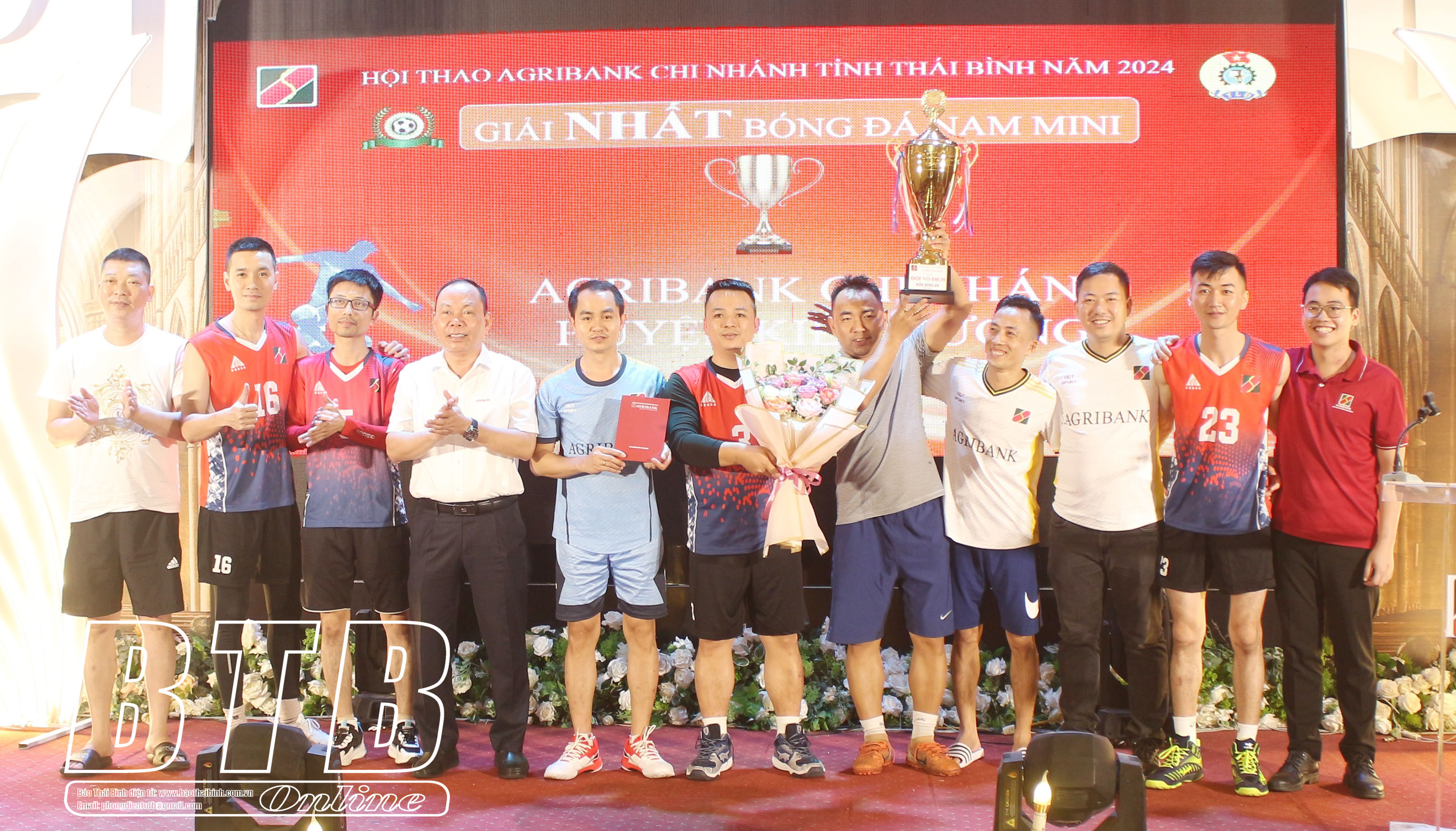 Lãnh đạo Agribank Chi nhánh tỉnh Thái Bình tặng hoa và cúp cho Agribank Chi nhánh huyện Kiến Xương đạt giải nhất môn bóng đá mini.