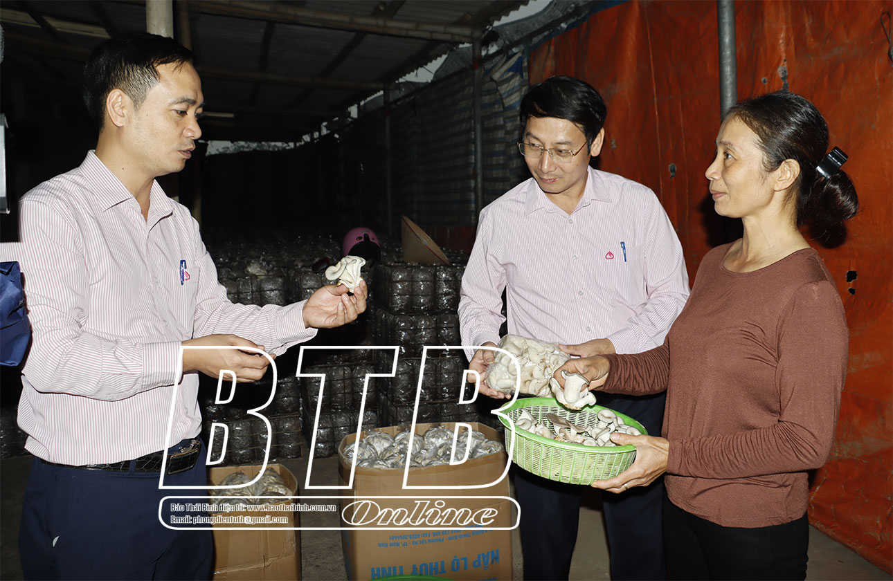 Chị Dung cho biết: Khi bắt đầu xây dựng trại sản xuất nấm sò, gia đình đã được Phòng giao dịch Ngân hàng CSXH huyện cho vay 90 triệu đồng. Sau vài năm trồng nấm hiệu quả, gia đình đã hoàn trả xong số vốn vay đó và tiếp tục được Phòng giao dịch Ngân hàng CSXH huyện cho vay vốn bổ sung để đầu tư mở rộng quy mô sản xuất. Trên diện tích 8 sào, gia đình đang treo 8 vạn bịch nấm sò, giải quyết việc làm ổn định cho 10 lao động địa phương. Bình quân mỗi năm gia đình thu 40 - 50 tấn nấm tươi, tiêu thụ trong huyện và các tỉnh miền núi phía Bắc. Nhưng vừa qua, nấm sò của gia đình đang cho thu hoạch thì bị bão, gió làm tốc mái, nước lũ dâng cao hỏng hết các bịch nấm, thiệt hại nhiều. Rất may Phòng giao dịch Ngân hàng CSXH huyện không chỉ cho vay bổ sung vốn mà còn thực hiện các cơ chế xử lý nợ bị rủi ro do nguyên nhân khách quan theo quy định. Có sự quan tâm của cấp ủy, chính quyền với các cơ chế, chính sách hỗ trợ kịp thời, sát thực, ngành ngân hàng luôn đồng hành đã tạo động lực cho chúng tôi vượt khó, phát triển kinh tế, thoát nghèo, vươn lên làm giàu chính đáng.