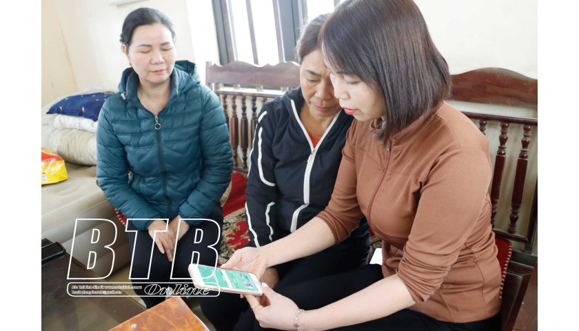 Bà Đức Thị Hoa (người ngoài cùng bên phải), tổ trưởng tổ tiết kiệm và vay vốn thôn Đông Bình Cách, xã Đông Xá (Đông Hưng) sử dụng phần mềm quản lý tín dụng chính sách tra cứu thông tin khách hàng.