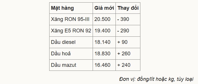 Giá xăng RON 95-III (loại phổ biến trên thị trường) giảm 390 đồng, xuống 20.500 đồng một lít. E5 RON 92 ở mức 19.400 đồng một lít, bớt 290 đồng.