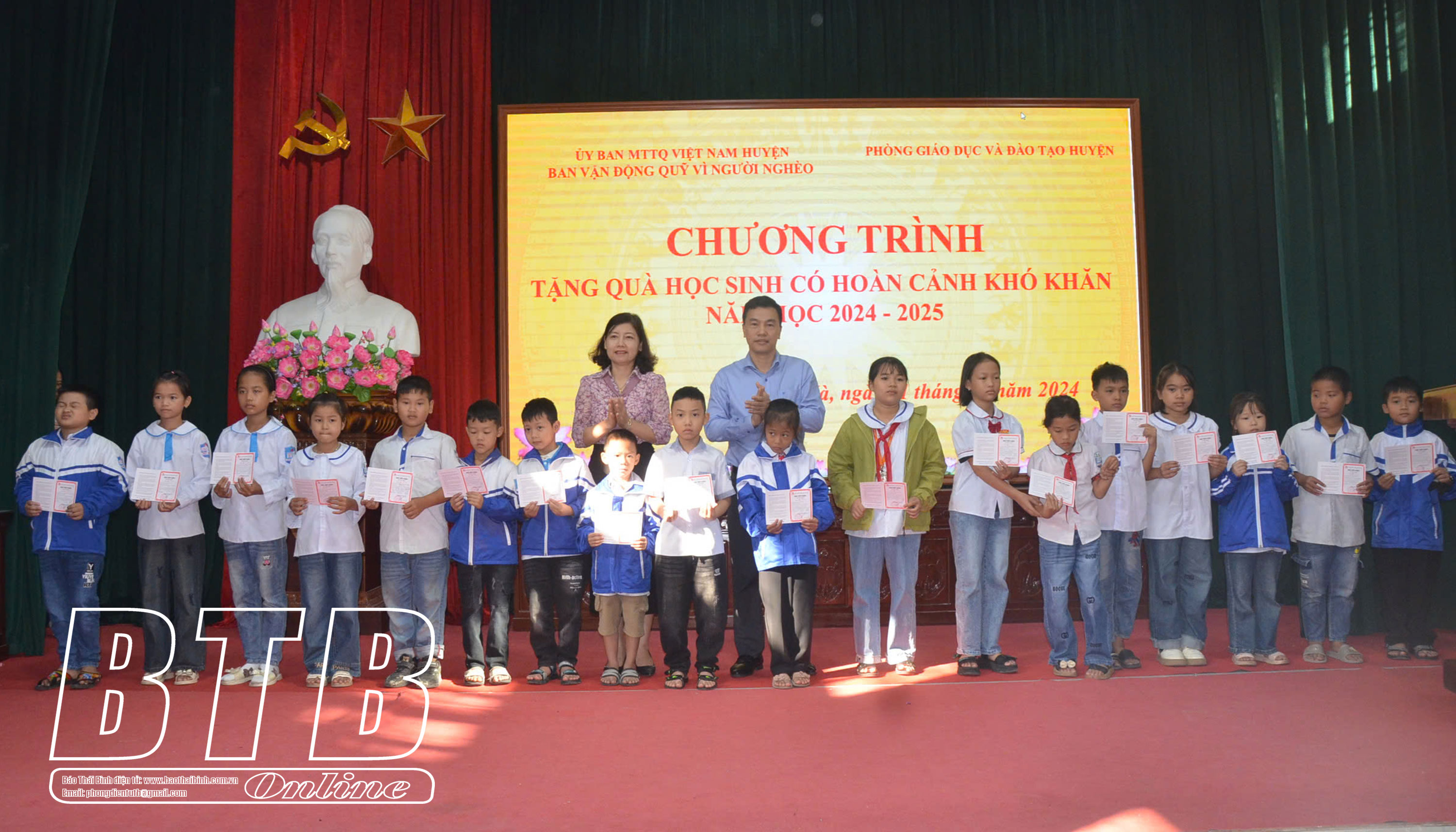 Trong tổng số 76 học sinh được trao tặng đợt này, có 41 học sinh nghèo thuộc các khối trường THPT và THCS được trao tặng xe đạp, 35 học sinh cấp tiểu học có hoàn cảnh đặc biệt khó khăn được trao tặng sổ tiết kiệm. Tổng trị giá trao tặng xe đạp và sổ tiết kiệm hơn 150 triệu đồng được trích từ quỹ “Vì người nghèo” của huyện.
