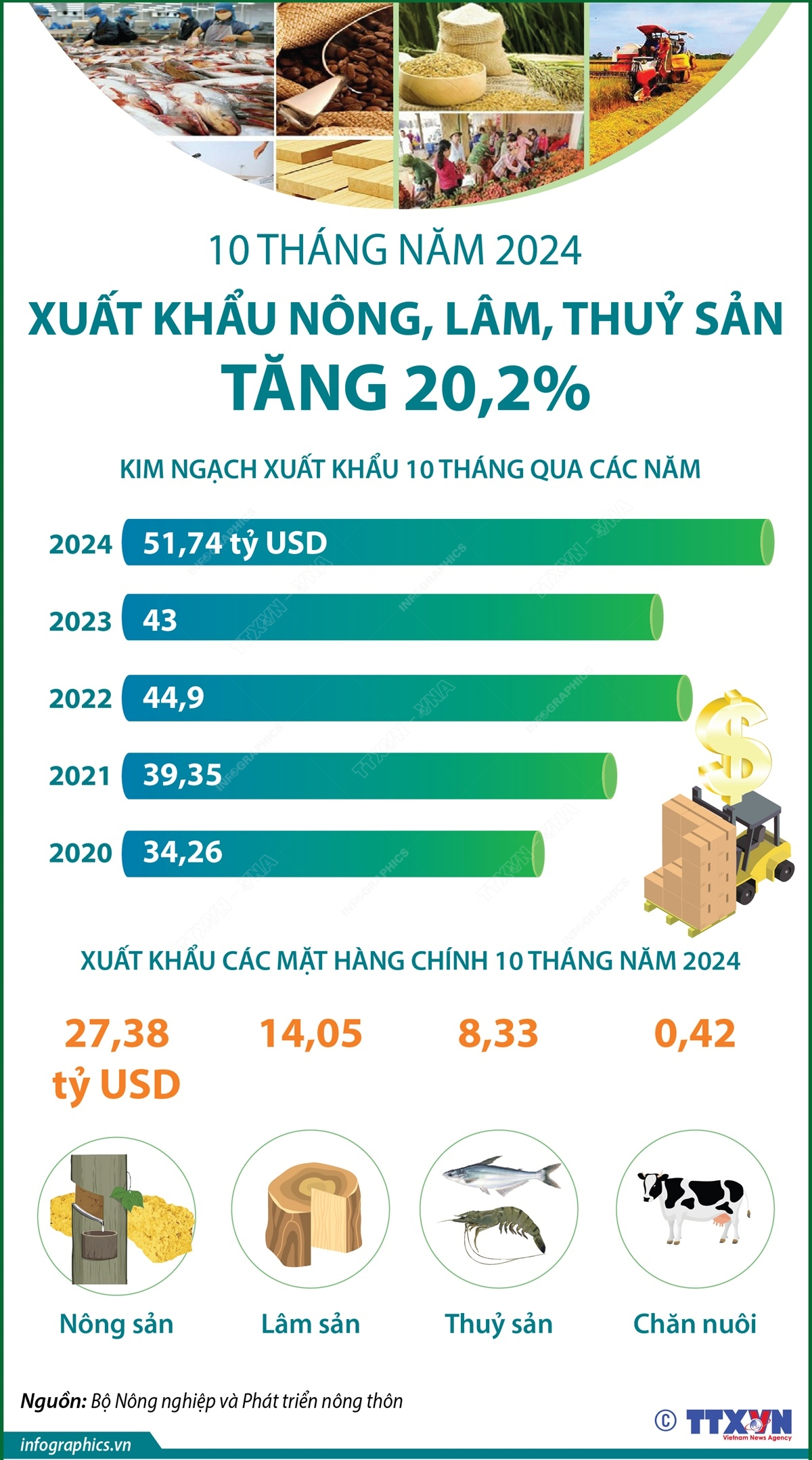 Tổng kim ngạch xuất khẩu nông, lâm, thủy sản 10 tháng năm 2024 đạt 51,74 tỷ USD, tăng 20,2% so với cùng kỳ năm 2023. Giá trị xuất siêu nông lâm thủy sản 10 tháng đạt 15,21 tỷ USD, tăng 62,2% so với cùng kỳ năm trước.