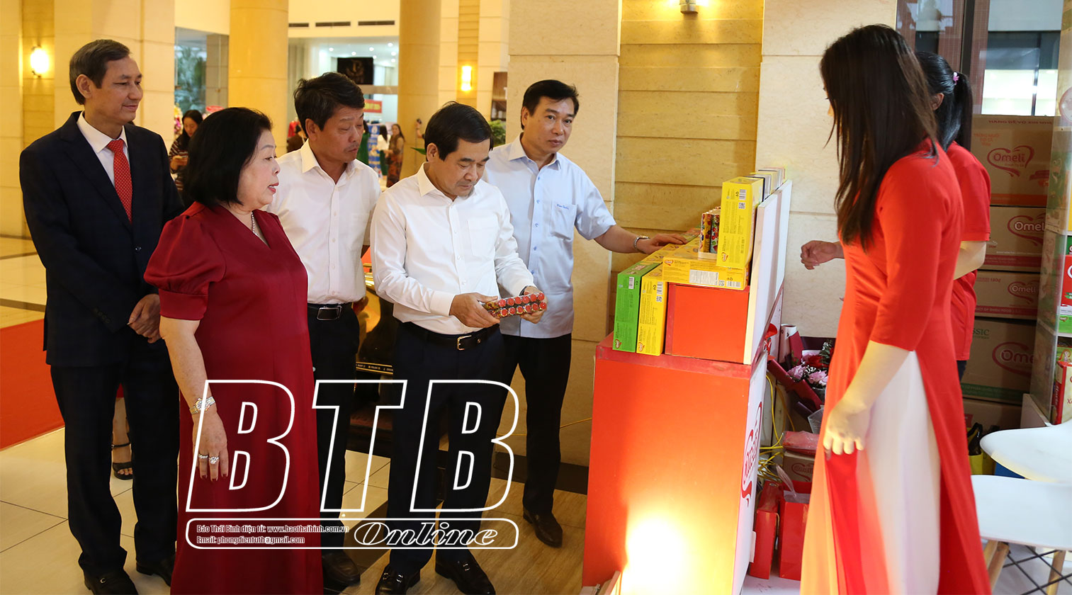Đồng chí Nguyễn Tiến Thành, Phó Bí thư thường trực Tỉnh ủy, Chủ tịch HĐND tỉnh tham quan gian hàng trưng bày các sản phẩm tiêu biểu của Hội Doanh nhân nữ tỉnh Thái Bình. Ảnh: Trịnh Cường