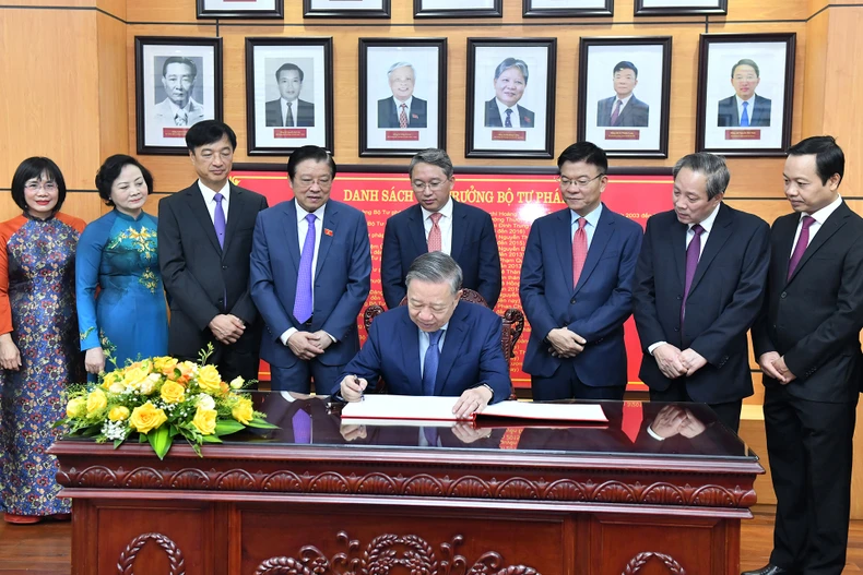 Tổng Bí thư Tô Lâm ghi sổ lưu niệm tại Phòng Truyền thống của Bộ Tư pháp. (Ảnh: ĐĂNG KHOA).