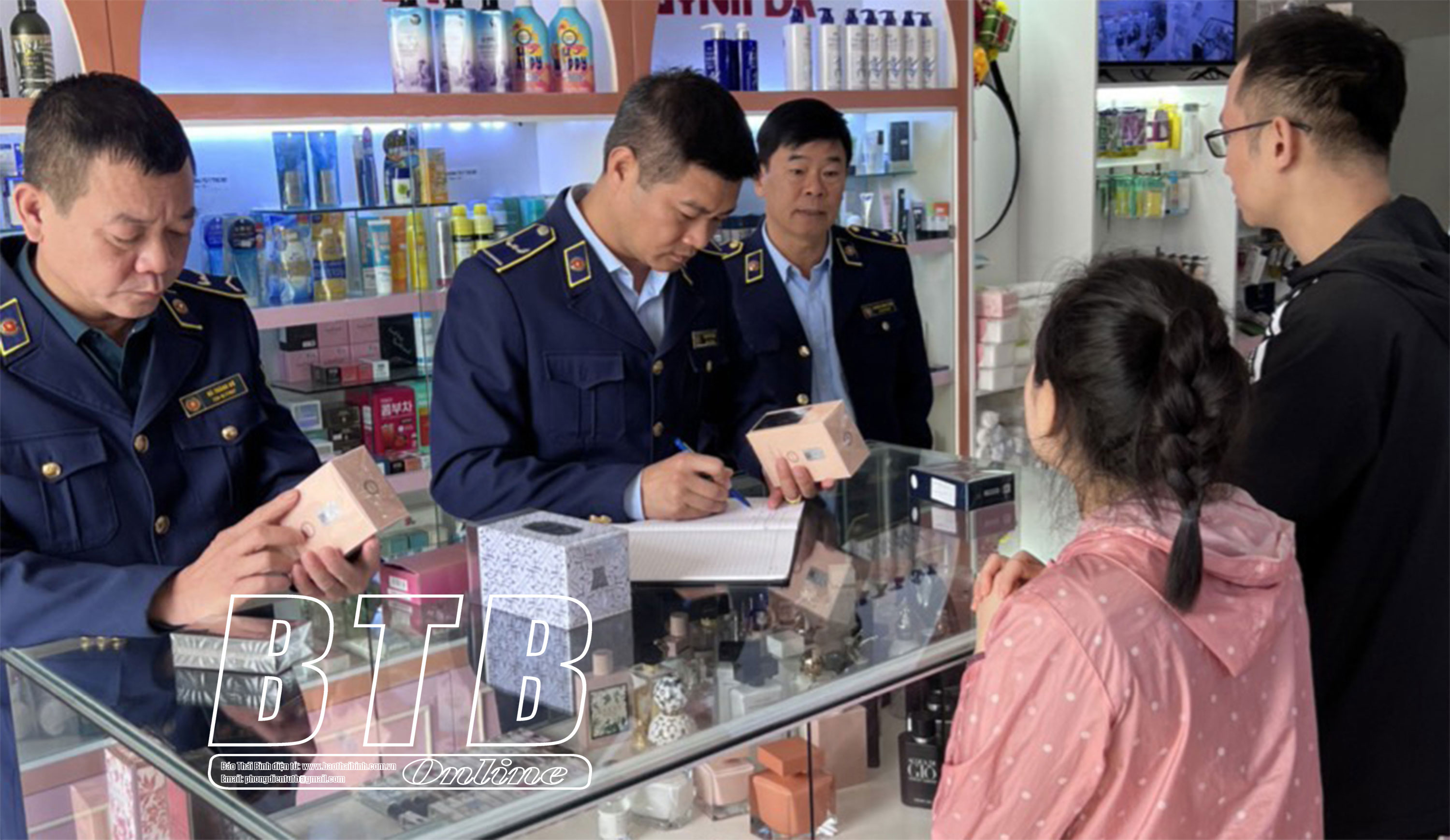 Lực lượng Quản lý thị trường kiểm tra hoạt động kinh doanh mỹ phẩm, thực phẩm chức năng của một cửa hàng trên địa bàn thành phố Thái Bình.