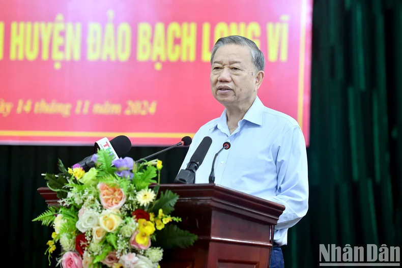 Nhấn mạnh, Chiến lược phát triển bền vững kinh tế biển Việt Nam đến năm 2030, tầm nhìn đến năm 2045 đã xác định: “Việt Nam phải trở thành quốc gia mạnh về biển, giàu từ biển, phát triển bền vững, thịnh vượng, an ninh và an toàn; phát triển bền vững kinh tế biển gắn liền với bảo đảm quốc phòng, an ninh, giữ vững độc lập, chủ quyền và toàn vẹn lãnh thổ”, Tổng Bí thư Tô Lâm đề nghị từ tiềm năng, vị thế và lợi thế của đảo, Đảng bộ, chính quyền địa phương cần suy nghĩ về kế hoạch và cách làm cụ thể để biến Bạch Long Vĩ trở thành pháo đài bảo vệ vùng biển, vùng trời ta trên Vịnh Bắc Bộ, thành trung tâm dịch vụ hậu cần nghề cá, phát triển nuôi trồng thủy hải sản và thu hút khách du lịch, như tinh thần nghị quyết của Bộ Chính trị.
