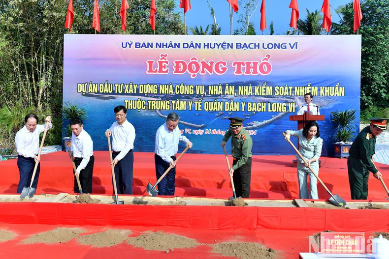 Cũng trong chương trình làm việc, Tổng Bí thư đã dự Lễ động thổ Dự án xây dựng nhà công vụ, nhà ăn, nhà kiểm soát nhiễm khuẩn thuộc Trung tâm y tế Quân- Dân-Y huyện Bạch Long Vĩ. Dự án quy mô gồm hai khu nhà 2 tầng, 14 phòng chức năng, tổng diện tích sàn khoảng 780m2, đầu tư trang thiết bị đồng bộ và hiện đại. Công trình hoàn thành đưa vào sử dụng sẽ góp phần nâng cao năng lực, chất lượng khám, điều trị bệnh của Trung tâm y tế quân dân y Bạch Long Vĩ.