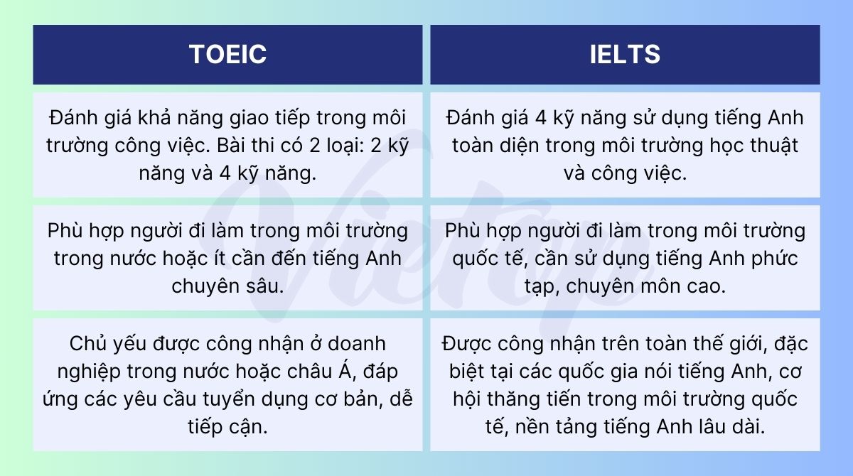 Mời bạn tham khảo qua bảng so sánh TOEIC và IELTS để dễ dàng lựa chọn chứng chỉ phù hợp với nhu cầu công việc: