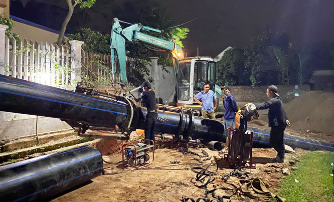 Công nhân lắp đặt đường ống dẫn nước sạch tại huyện Đông Anh. Ảnh: Nguyễn Quang