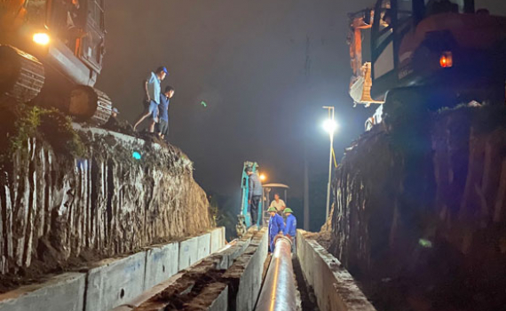 Công nhân Công ty cổ phần Cấp nước Mê Linh thi công đường ống nước sạch trên địa bàn huyện Mê Linh. Ảnh: Thanh Mai