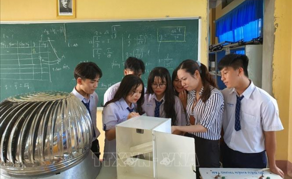 Trần Hữu Tỉ và cô giáo hướng dẫn Vũ Thị Thúy Hằng, giáo viên bộ môn Vật Lý nghiên cứu cải tiến mô hình máy tạo ra nước sạch từ năng lượng điện gió. Ảnh: Ánh Tuyết/TTXVN