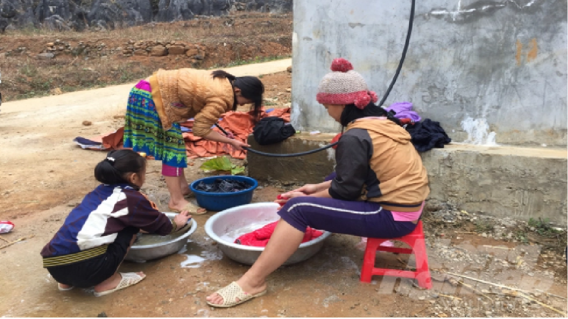 Người dân tộc Mông xóm Lũng Ngần, xã Hồng Sỹ, huyện Hà Quảng sử dụng nước tại bể nước tập trung. Ảnh: Công Hải.