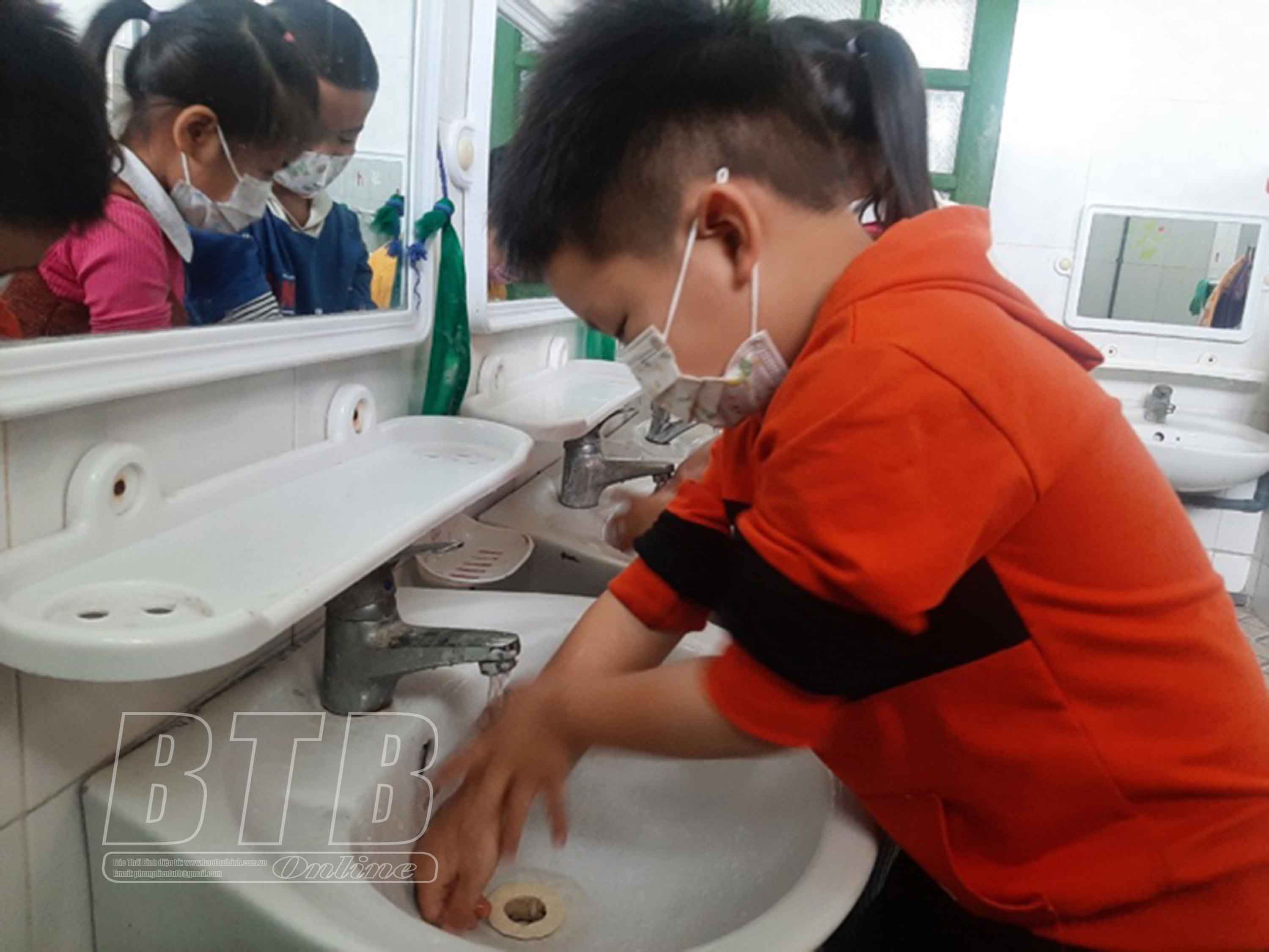 Học sinh mầm non thực hành rửa tay bảo đảm vệ sinh tại trường học.