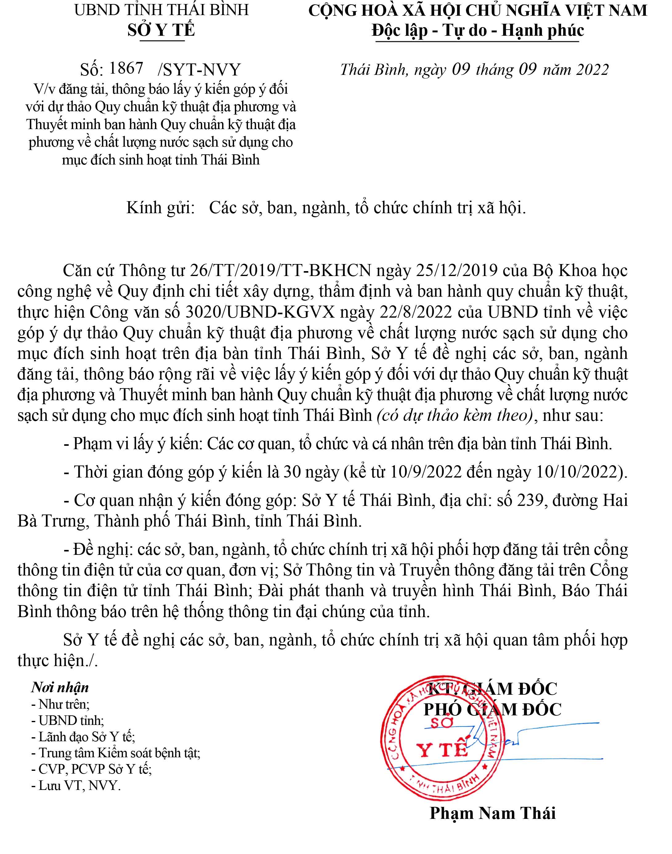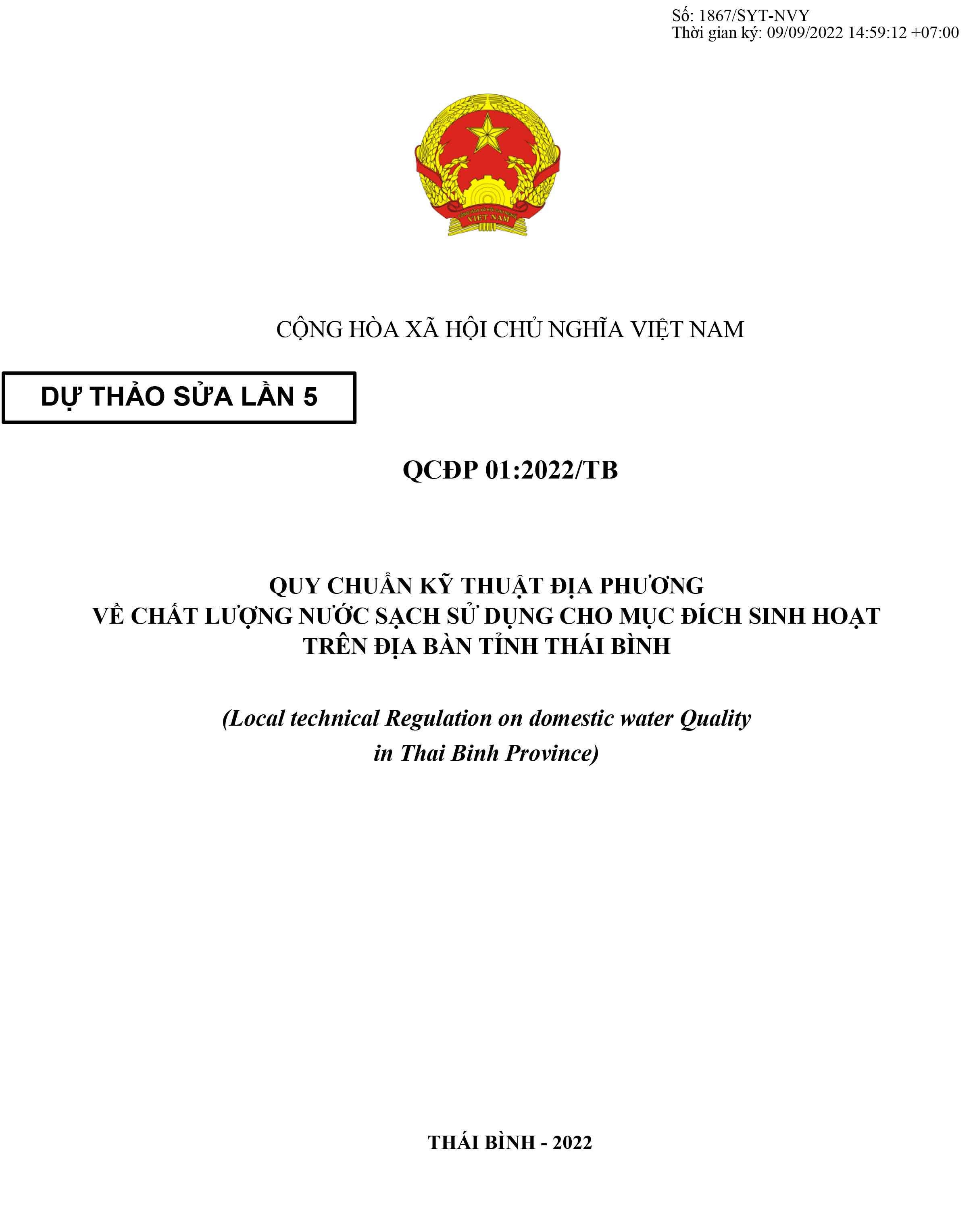 Lấy ý kiến góp ý đối với dự thảo Quy chuẩn kỹ thuật địa phương về chất lượng nước sạch sử dụng cho mục đích sinh hoạt tỉnh Thái Bình