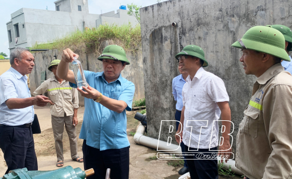 Kiểm tra việc bảo đảm cung cấp nước sạch phục vụ nhu cầu sinh hoạt của nhân dân tại trạm cấp nước xã Thượng Hiền (Kiến Xương), trạm cấp nước xã Tự Tân (Vũ Thư), đồng chí Đinh Vĩnh Thụy, Tỉnh ủy viên, Giám đốc Sở Nông nghiệp và Phát triển nông thôn yêu cầu: Các đơn vị cung cấp nước sạch trên địa bàn tỉnh thực hiện nghiêm túc Công văn số 1600 ngày 22/5 của UBND tỉnh về việc bảo đảm cung cấp nước sạch phục vụ nhân dân trong dịp hè năm 2023; chủ động phối hợp với ngành điện hoặc có phương án cấp cấp điện riêng để bảo đảm nguồn điện cho hoạt động quản lý, vận hành và cung cấp nước; xây dựng phương án, kế hoạch, thời gian cấp nước cụ thể và thông báo rộng rãi cho nhân dân các xã trong vùng cấp nước biết để chủ động trữ và sử dụng nước sạch; có phương án giải quyết kịp thời các khiếu nại của người dân về dịch vụ cấp nước; nghiêm túc thực hiện công tác xét nghiệm nội kiểm, ngoại kiểm bảo đảm chất lượng nước sạch.
