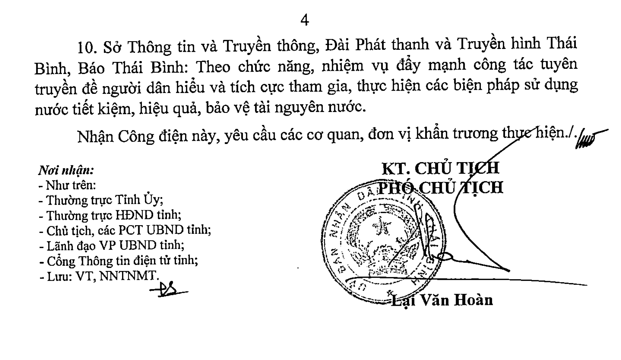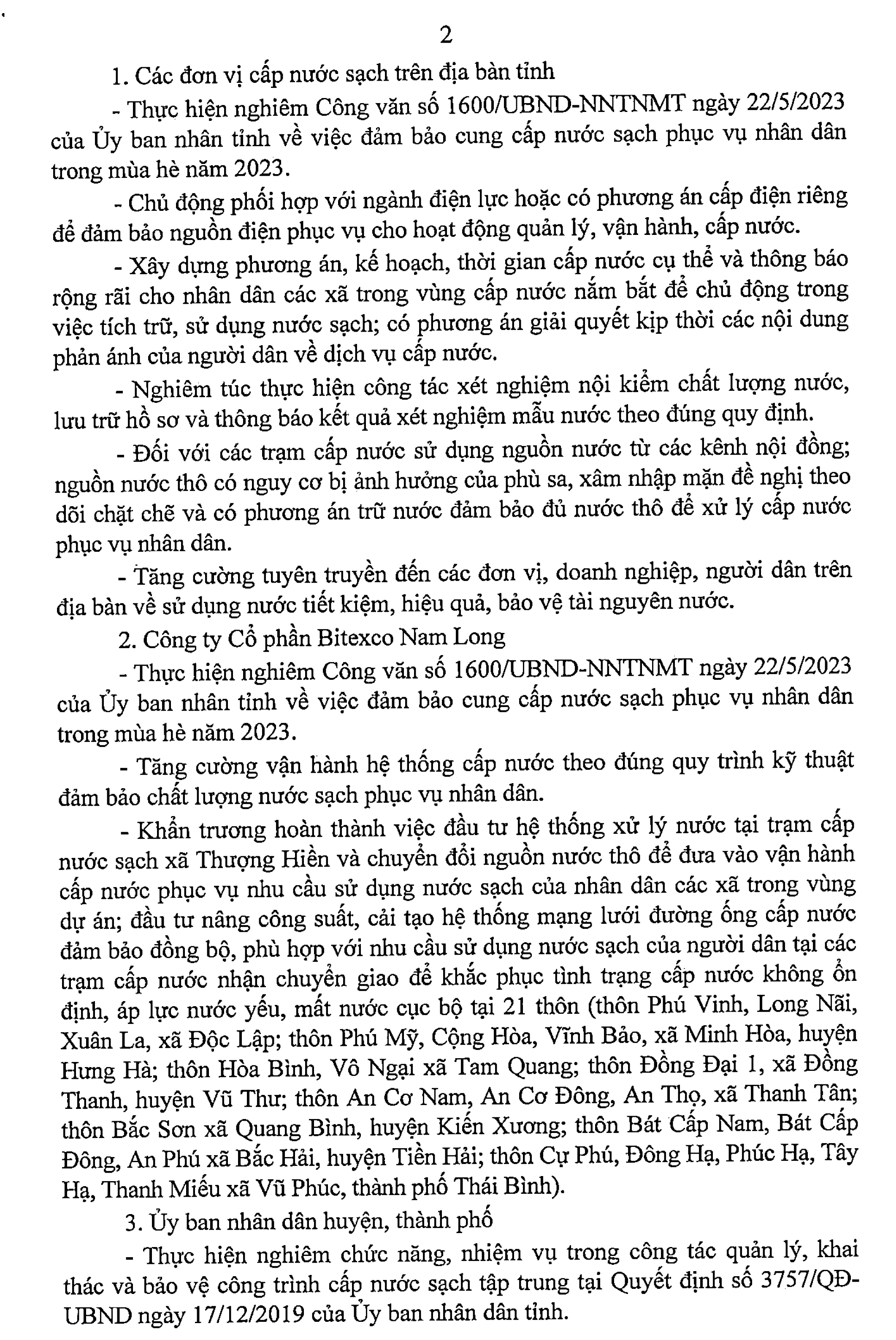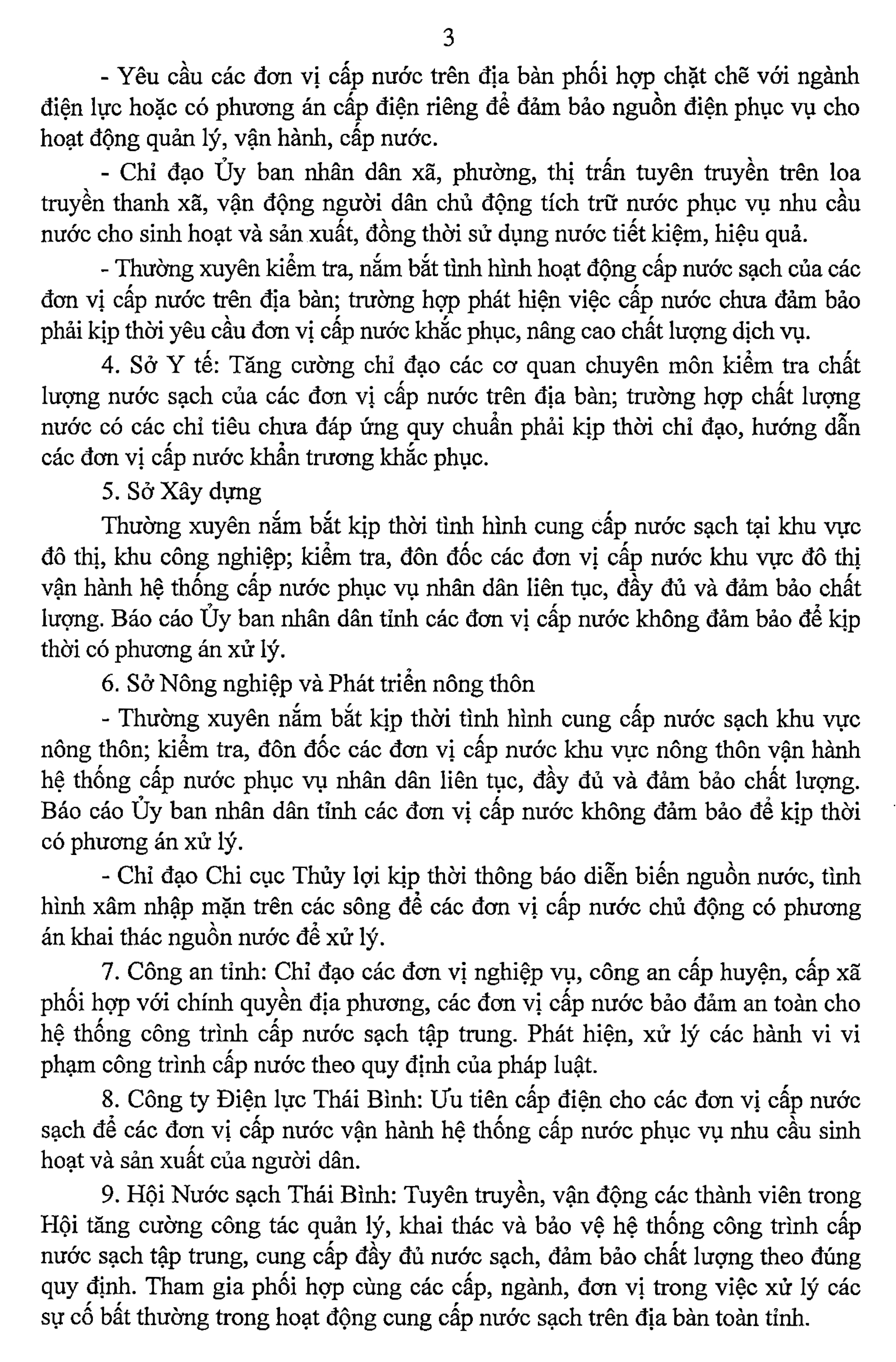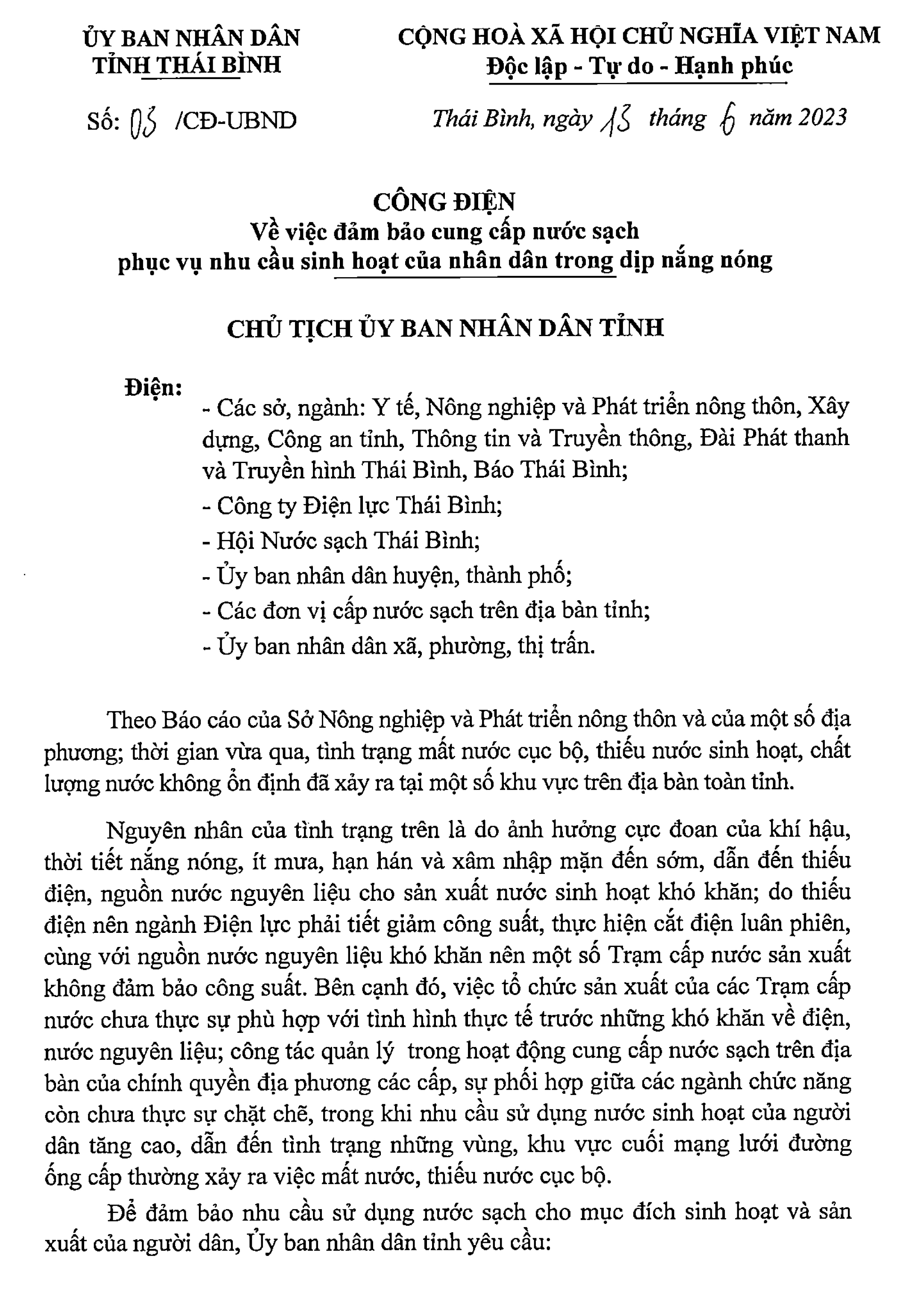 Công điện 03/CĐ-UBND ngày 13/6/2023 của Ủy ban nhân dân tỉnh Thái Bình về việc bảo đảm cung cấp nước sạch phục vụ nhu cầu sinh hoạt của nhân dân trong dịp nắng nóng.