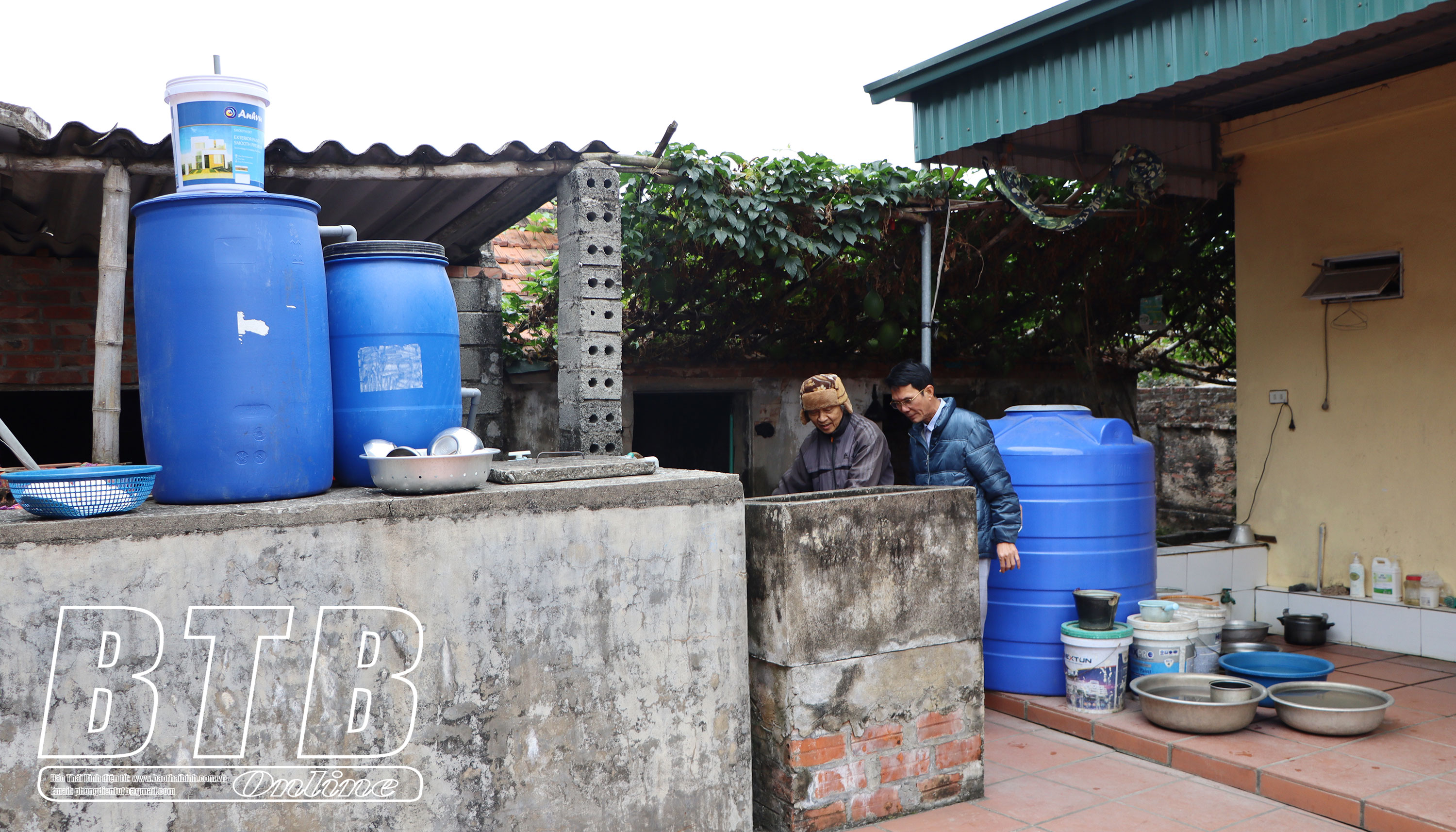 Do thiếu nước sạch, ông Trần Ngọc Trản, thôn An Thọ, xã Thanh Tân phải mua téc chứa nước mưa phục vụ sinh hoạt.