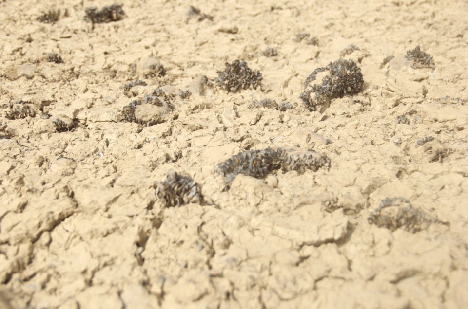 Sông cạn trơ đáy, lộ ra các con ốc, hến chết vì hạn hán.