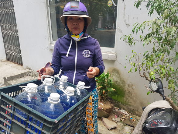 Một phụ nữ ở quận Sơn Trà phải đi mua từng chai nước để về cho gia đình nấu cơm