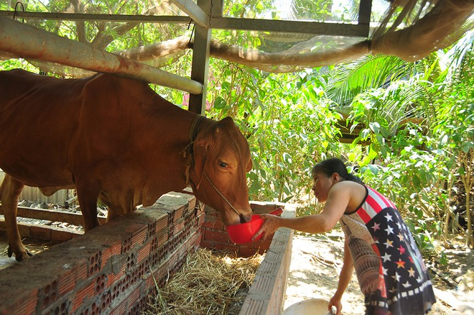 Bà Mai chắt chiu từng giọt nước cho bò uống