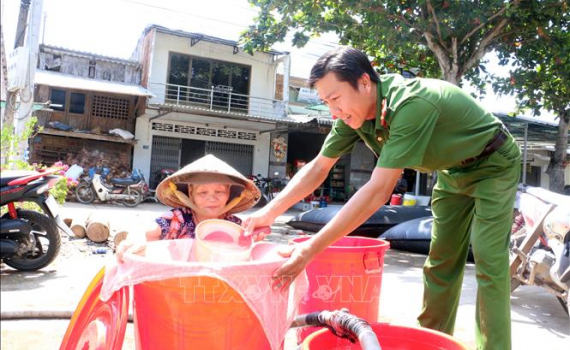 Chiến sĩ công an huyện Mỏ Cày Bắc phụ giúp người dân lấy nước vào thùng.