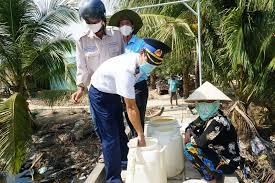 Lực lượng cảnh sát biển và Trung tâm NS -VSMTNT Sóc Trăng mang nước sạch đến từng hộ dân.