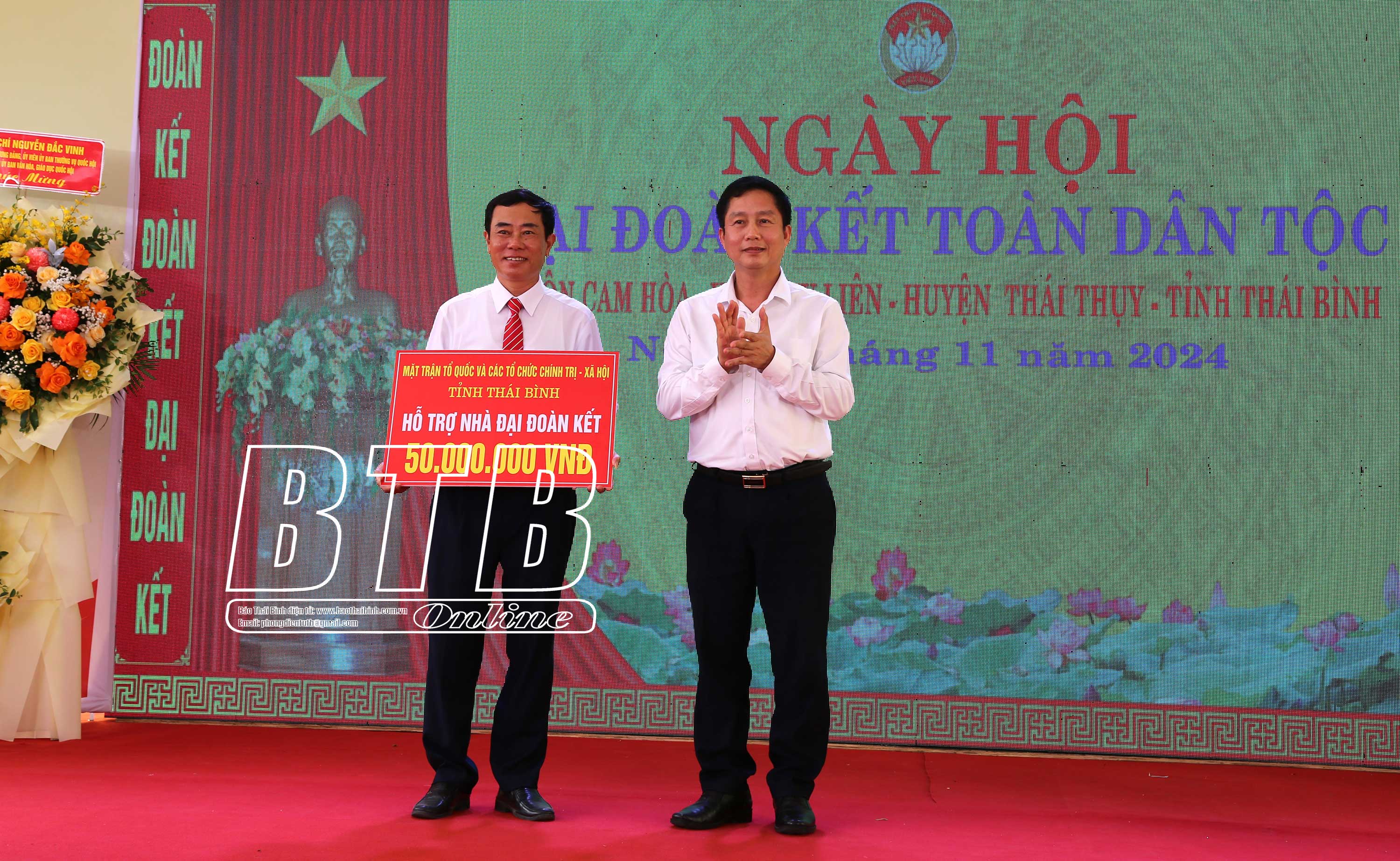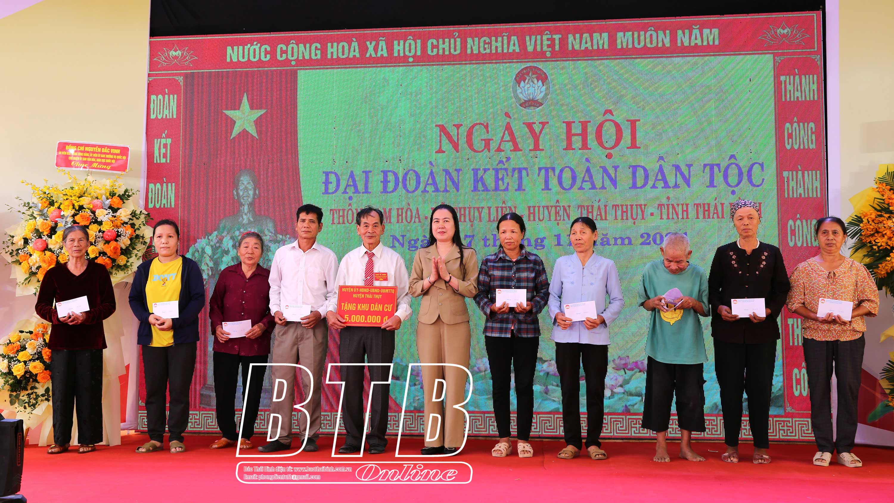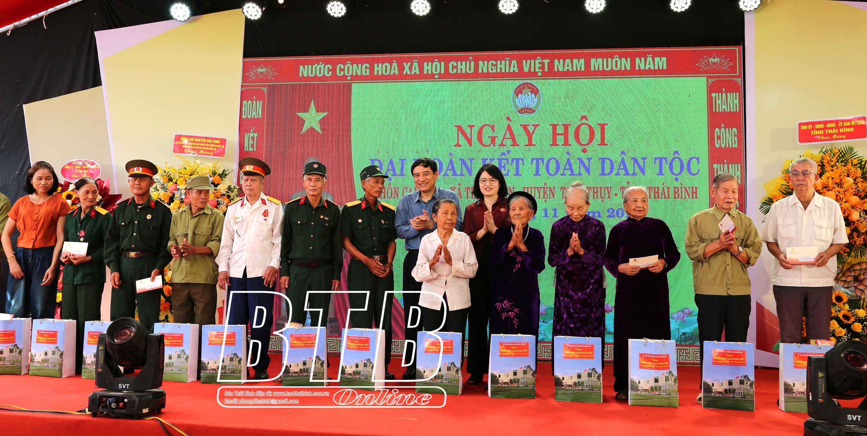 Đồng chí Nguyễn Đắc Vinh, Ủy viên Ban Chấp hành Trung ương Đảng, Ủy viên Ủy ban Thường vụ Quốc hội, Chủ nhiệm Ủy ban Văn hóa, Giáo dục của Quốc hội tặng quà đối tượng chính sách trong ngày hội. Đồng chí Nguyễn Đắc Vinh, Ủy viên Ban Chấp hành Trung ương Đảng, Ủy viên Ủy ban Thường vụ Quốc hội, Chủ nhiệm Ủy ban Văn hóa, Giáo dục của Quốc hội và lãnh đạo Đoàn đại biểu Quốc hội tỉnh tặng quà học sinh có hoàn cảnh khó khăn. Đồng chí Nguyễn Khắc Thận, Phó Bí thư Tỉnh ủy, Chủ tịch UBND tỉnh tặng quà nhân dân thôn Cam Hòa.Đồng chí Vũ Thanh Vân, Ủy viên Ban Thường vụ Tỉnh ủy, Chủ tịch Ủy ban MTTQ tỉnh trao kinh phí hỗ trợ xã Thụy Liên xây nhà đại đoàn kết.Lãnh đạo huyện Thái Thụy tặng quà nhân dân thôn Cam Hòa.