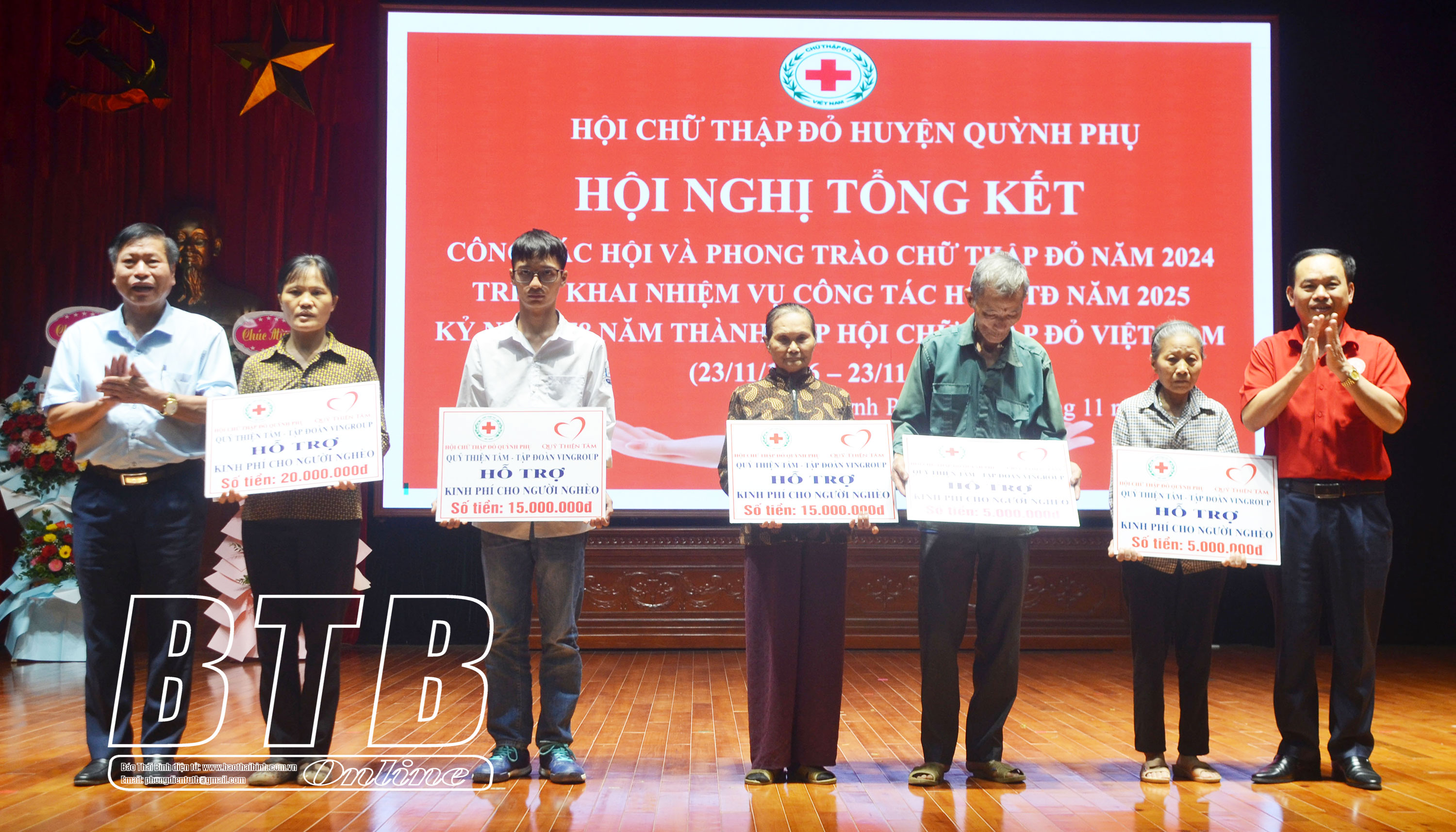 Năm 2024, công tác hội và phong trào CTĐ huyện Quỳnh Phụ hoạt động tích cực, đổi mới về phương pháp, hình thức và nội dung hoạt động, qua đó đạt nhiều kết quả khích lệ. Từ nguồn kinh phí của các cấp hội và nguồn huy động xã hội hóa được trên 14,6 tỷ đồng, hội CTĐ các cấp đã trao 13.115 suất quà tết trị giá trên 5,5 tỷ đồng cho các gia đình có hoàn cảnh khó khăn, học sinh nghèo vượt khó; xây mới 16 nhà, sửa chữa 7 nhà tình nghĩa cho hộ nghèo với tổng kinh phí trên 2,9 tỷ đồng; hỗ trợ phát triển sinh kế cho 119 hộ gia đình với kinh phí 475 triệu đồng...