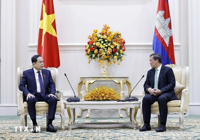 Chủ tịch Quốc hội Trần Thanh Mẫn hội kiến Thủ tướng Campuchia Samdech Hun Manet. (Ảnh: TTXVN).