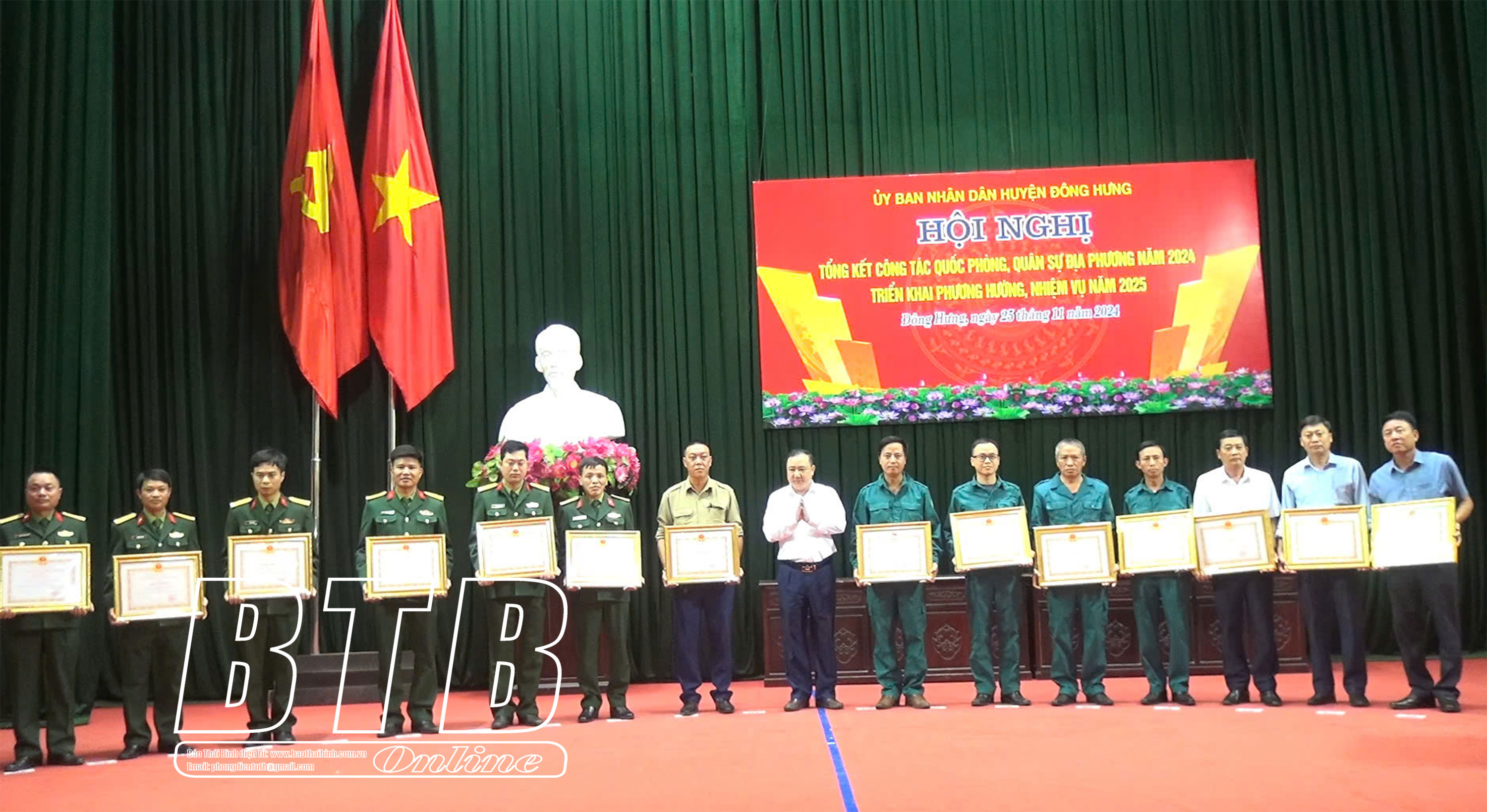 Lãnh đạo UBND huyện Đông Hưng trao giấy khen của Chủ tịch UBND huyện cho các tập thể hoàn thành xuất sắc nhiệm vụ quân sự, quốc phòng địa phương năm 2024.