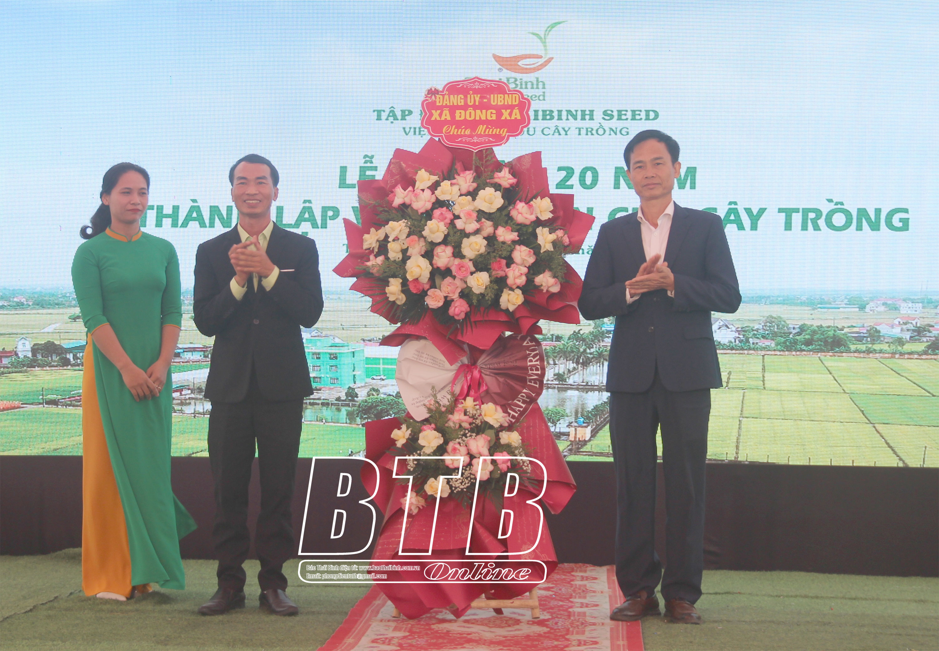 Lãnh đạo xã Đông Xá (Đông Hưng) tặng hoa chúc mừng Viện Nghiên cứu cây trồng (tập đoàn ThaiBinh Seed).