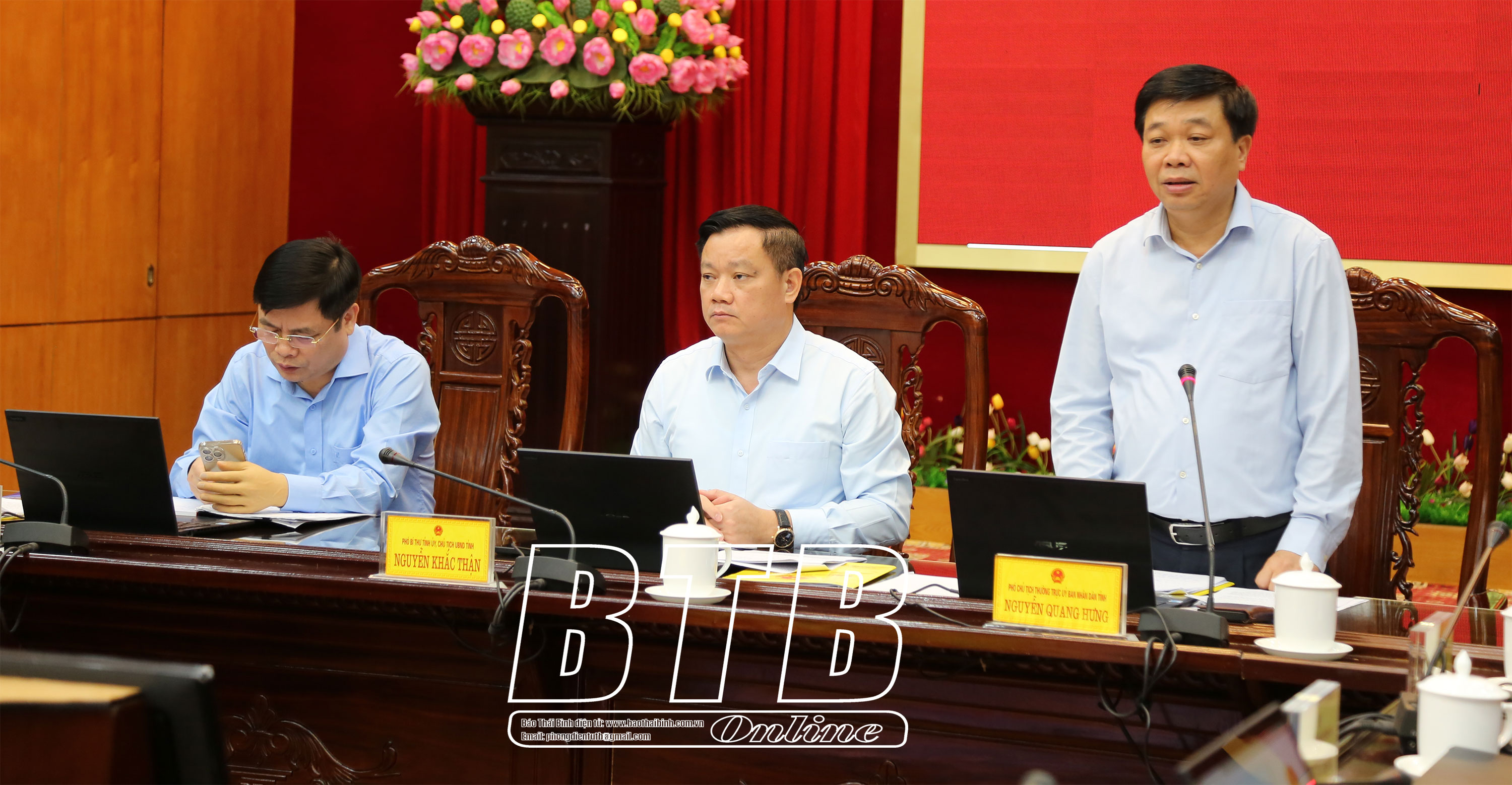 Đồng chí Nguyễn Quang Hưng, Ủy viên Ban Thường vụ Tỉnh ủy, Phó Chủ tịch thường trực UBND tỉnh phát biểu tại cuộc họp.