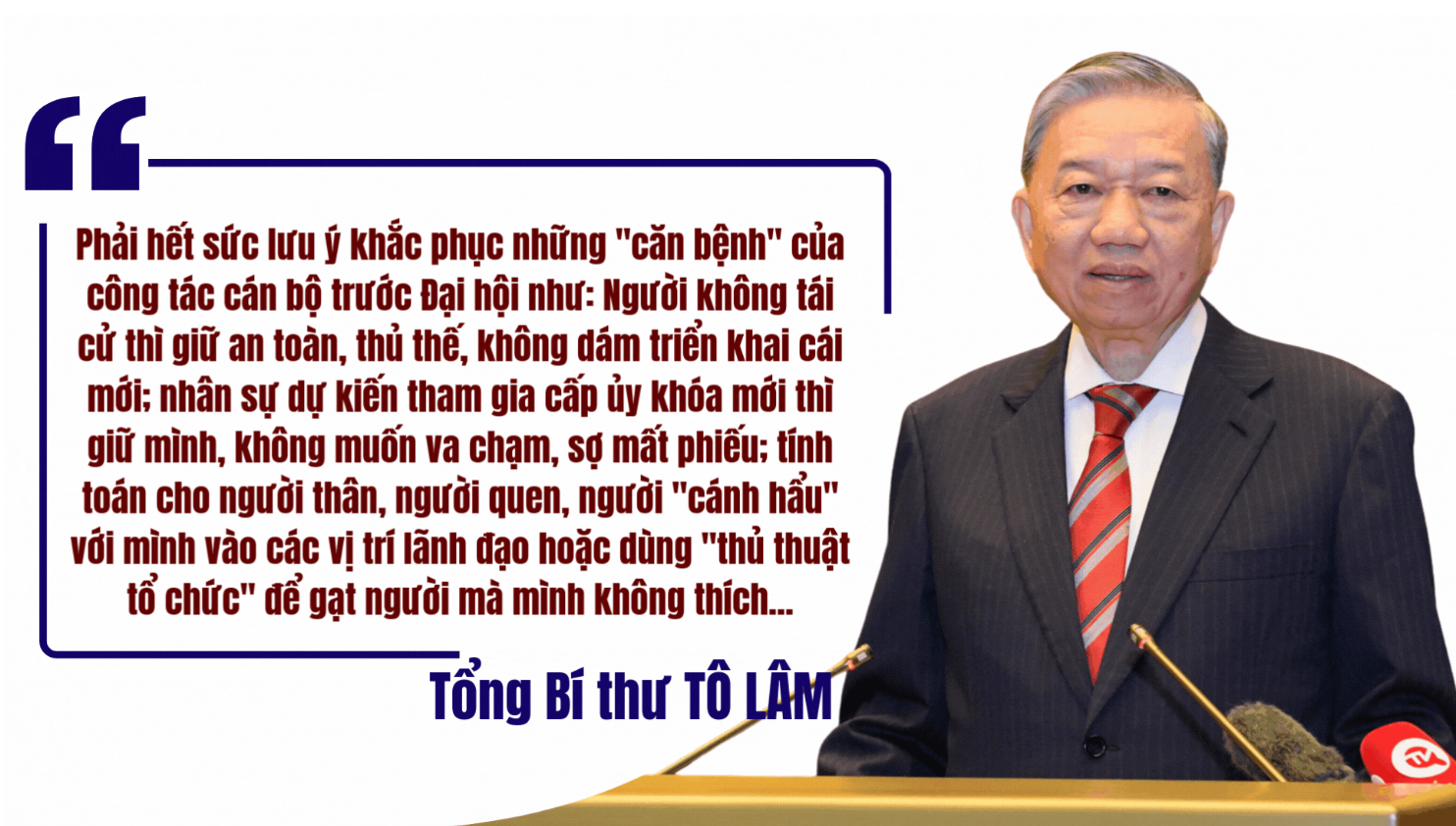 Phải hết sức lưu ý khắc phục những "căn bệnh" của công tác cán bộ trước Đại hội như: Người không tái cử thì giữ an toàn, thủ thế, không dám triển khai cái mới; nhân sự dự kiến tham gia cấp ủy khóa mới thì giữ mình, không muốn va chạm, sợ mất phiếu; tính toán cho người thân, người quen, người "cánh hẩu" với mình vào các vị trí lãnh đạo hoặc dùng "thủ thuật tổ chức" để gạt người mà mình không thích...
