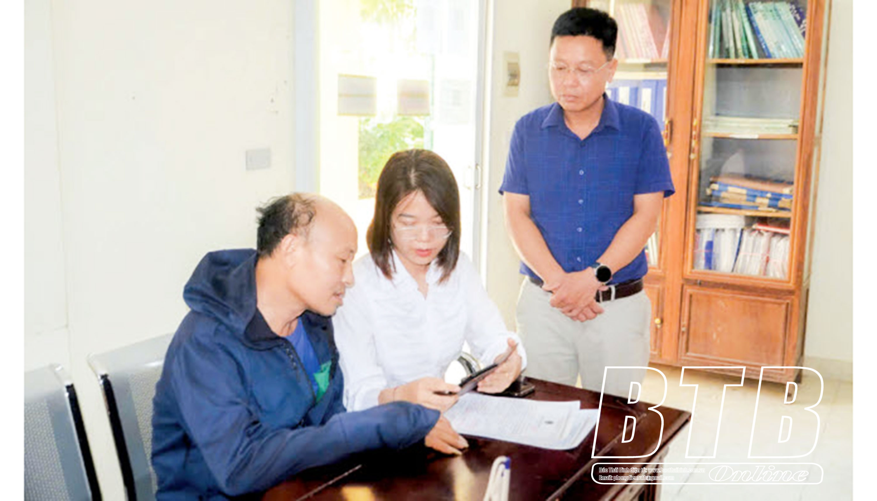 Cán bộ, công chức Bộ phận tiếp nhận và trả kết quả xã Vũ Đoài (Vũ Thư) hướng dẫn người dân cách đăng ký tài khoản, nộp hồ sơ trực tuyến.