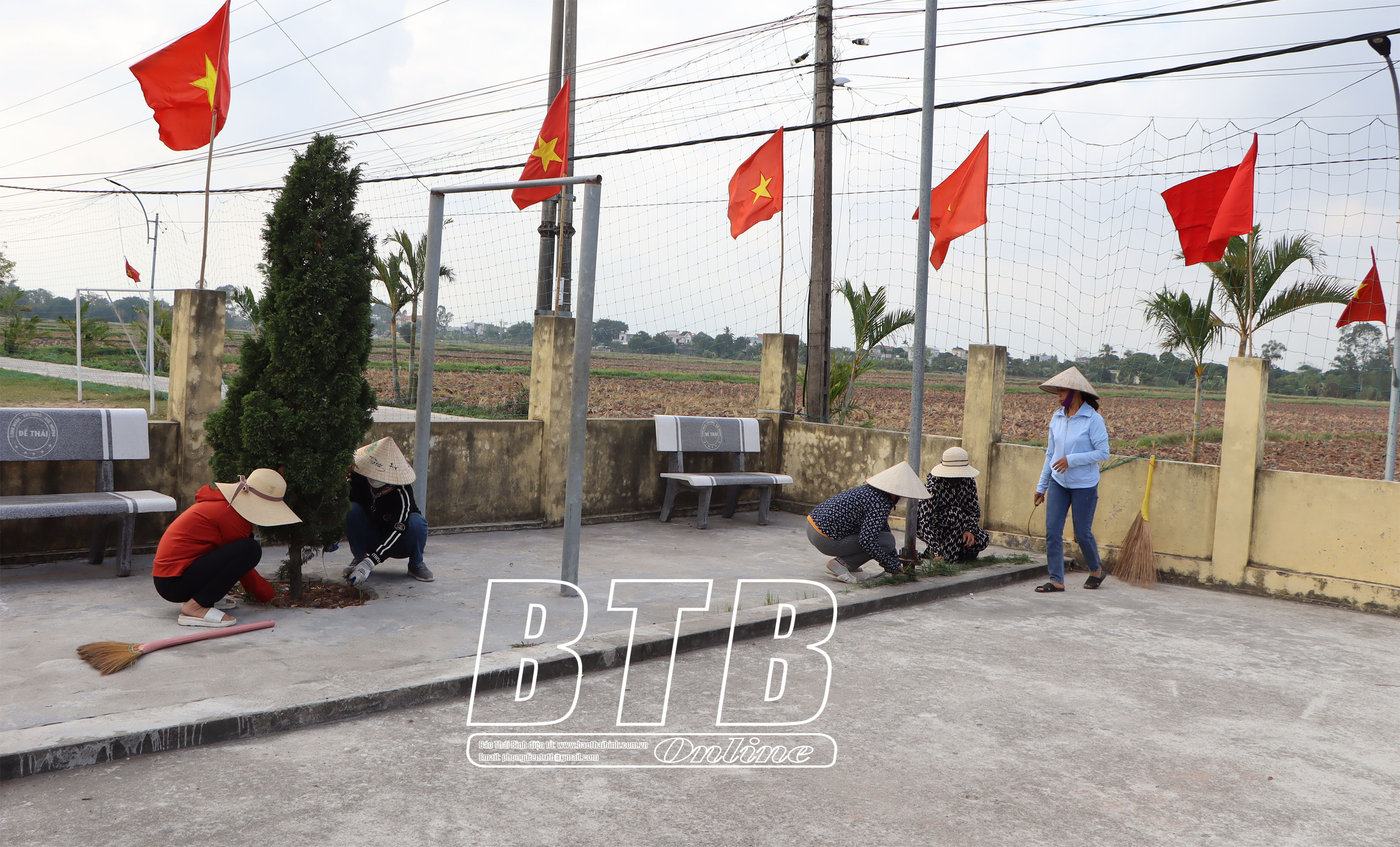 Phụ nữ thôn Đề Thái dọn cỏ khu vực nhà văn hóa thôn.