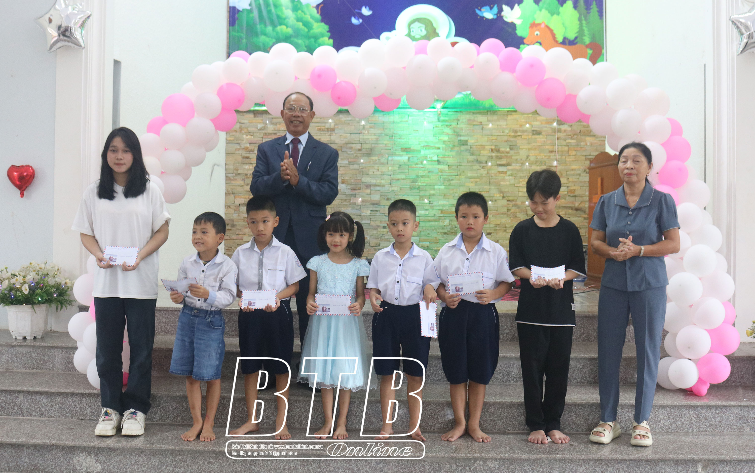 Đảng viên theo đạo Tin lành Trần Thị Nhuận, Hội thánh Tin lành Khả Cảnh, xã Hồng Tiến trao quà khuyến học cho học sinh.
