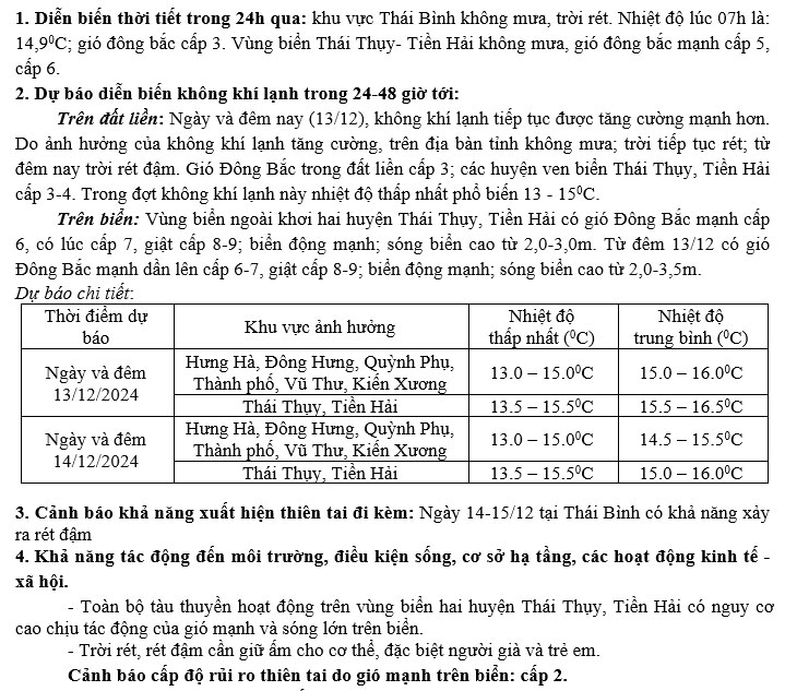 Tin không khí lạnh tăng cường và rét tỉnhThái Bình