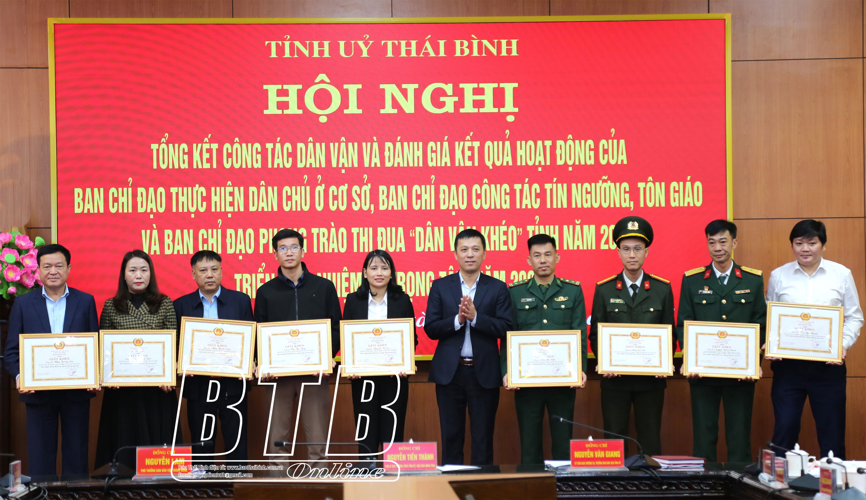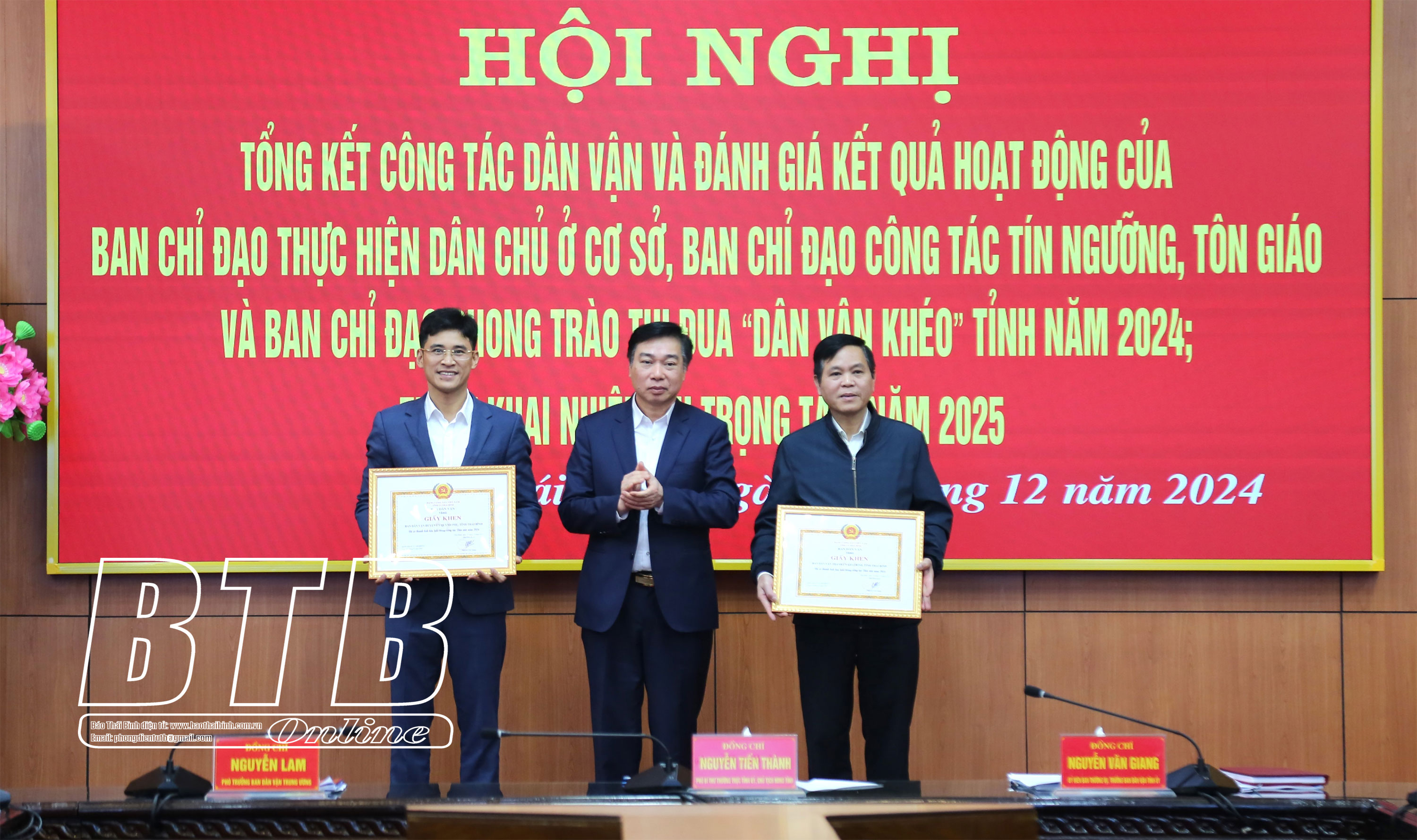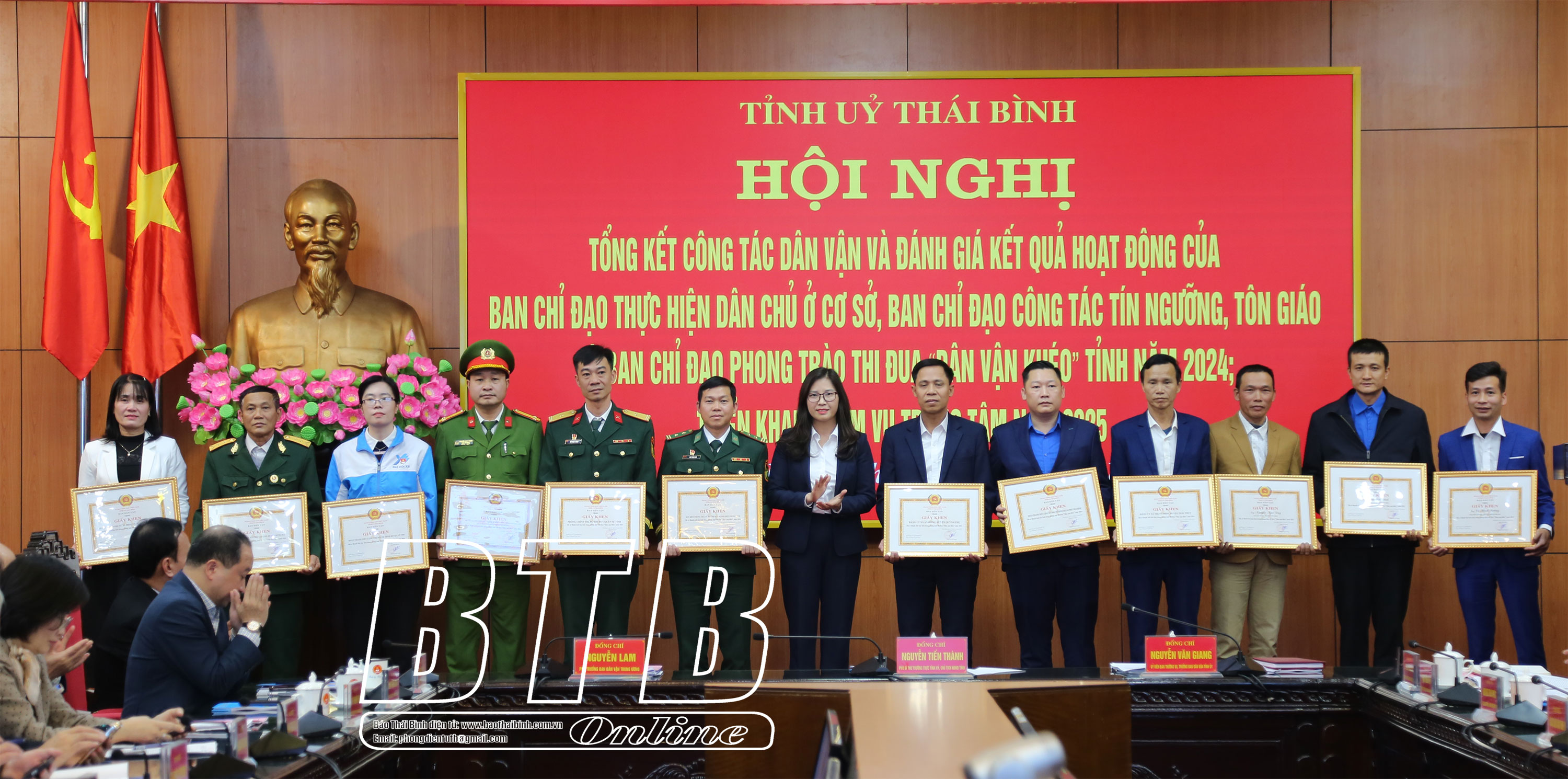 Nhân dịp này, đồng chí Phó Trưởng ban Dân vận Trung ương trao tặng Kỷ niệm chương “Vì sự nghiệp dân vận” cho các cá nhân có nhiều đóng góp cho sự nghiệp dân vận của Đảng; lãnh đạo Ban Dân vận Tỉnh ủy trao tặng giấy khen cho 12 tập thể, cá nhân có thành tích xuất sắc trong công tác dân vận và 12 tập thể, cá nhân có thành tích tiêu biểu trong phong trào thi đua “Dân vận khéo” năm 2024.