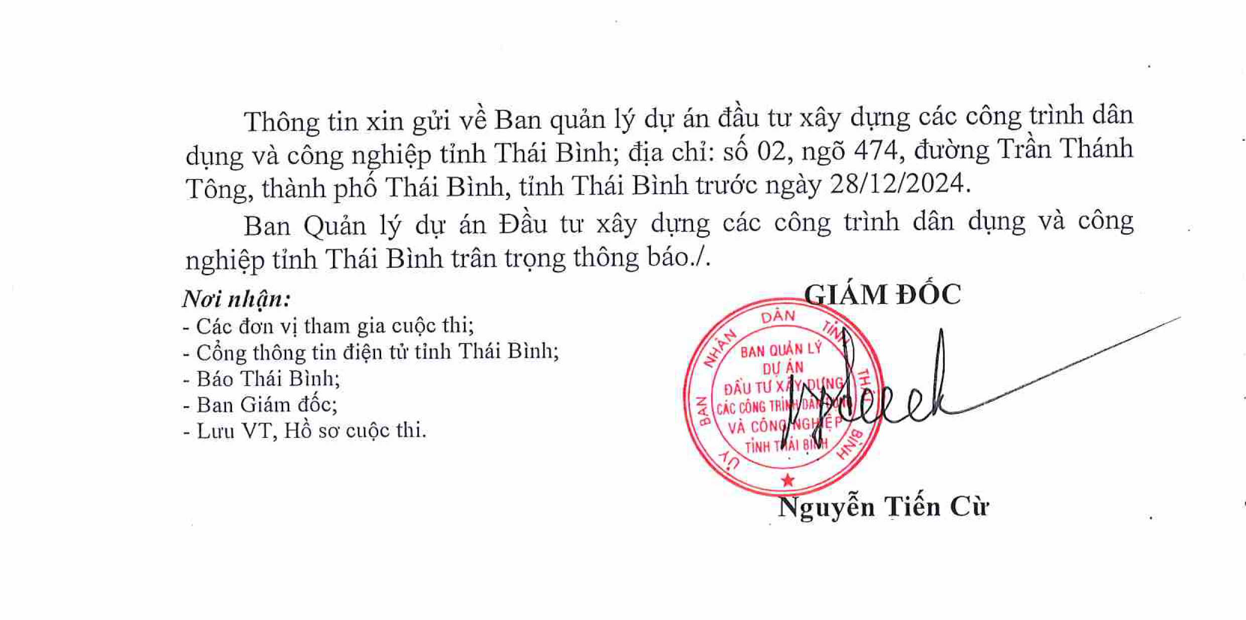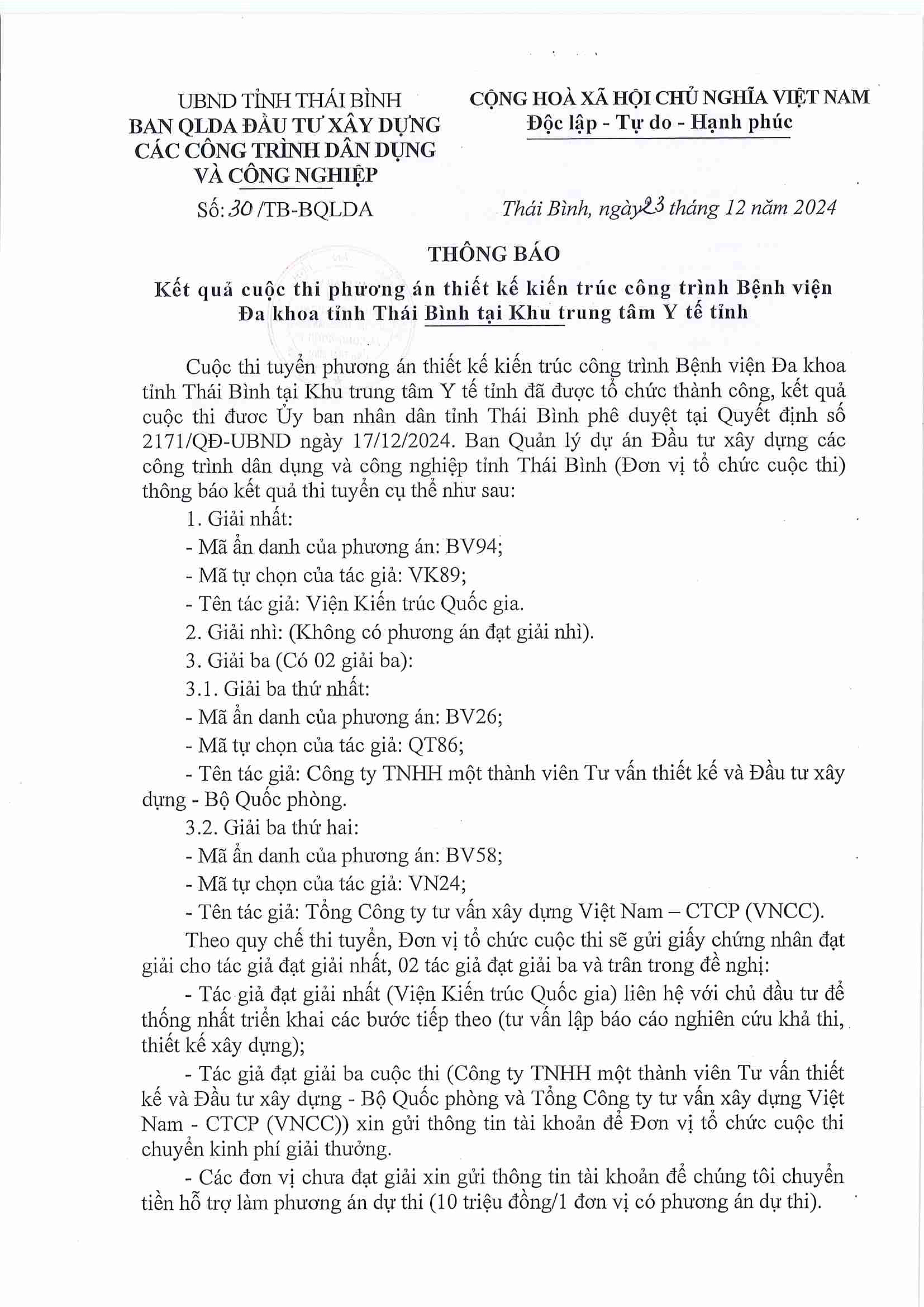 Thông báo kết quả cuộc thi phương án thiết kế kiến trúc công trình Bệnh viện Đa khoa tỉnh Thái Bình tại Khu trung tâm Y tế tỉnh