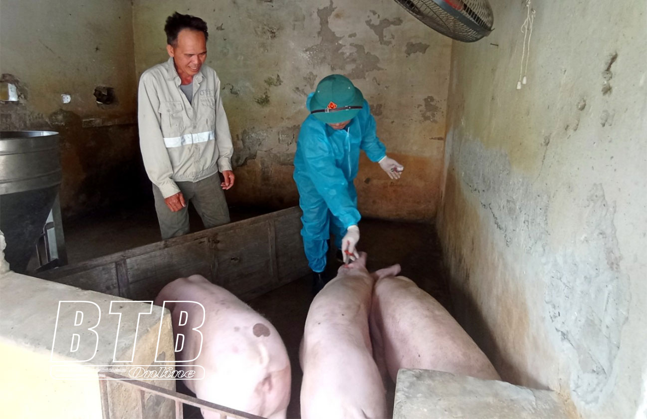Cán bộ thú y xã Quỳnh Lâm (Quỳnh Phụ) tổ chức tiêm vắc-xin phòng bệnh cho đàn lợn tại địa phương.