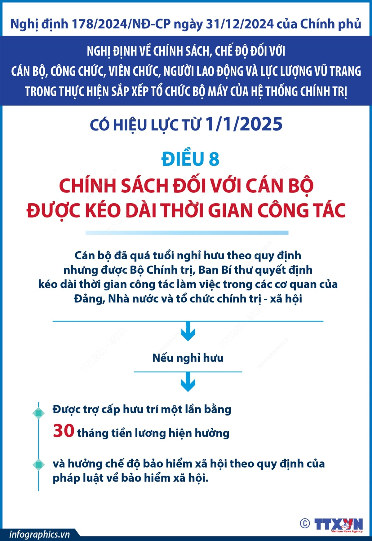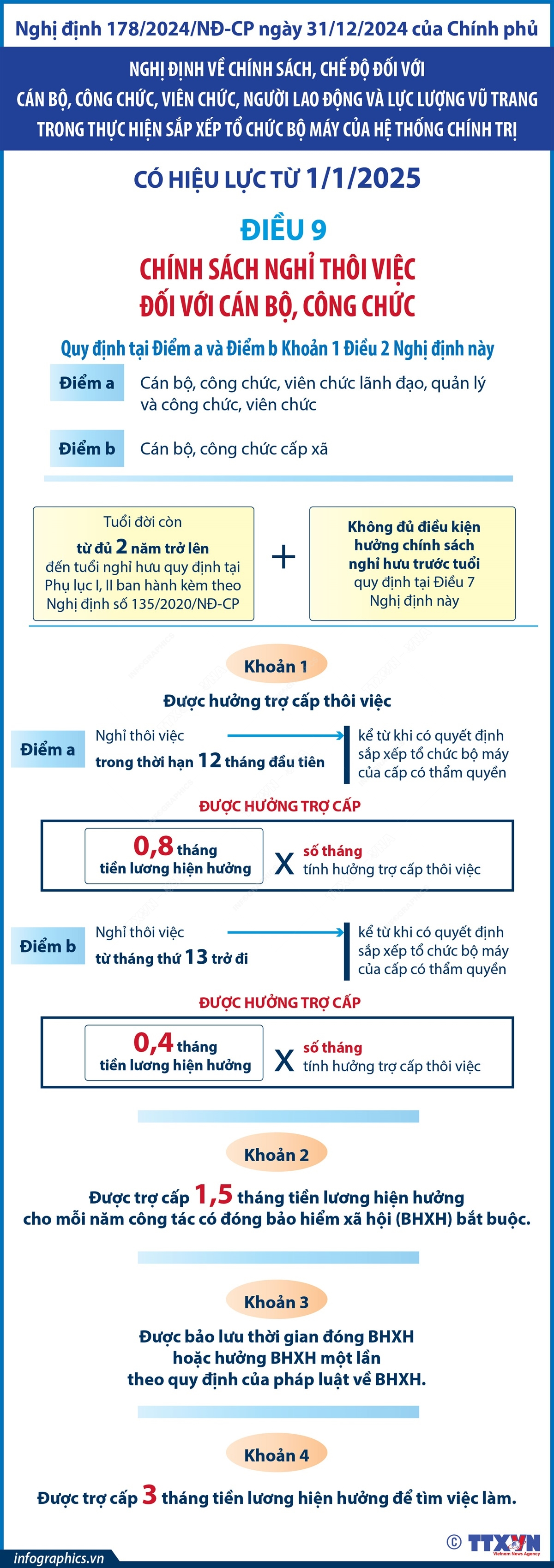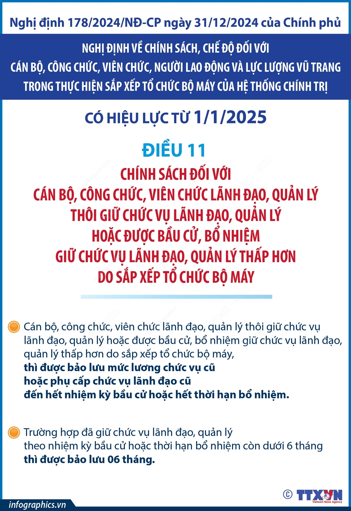 Nghị định số 178/2024/NĐ-CP ngày 31/12/2024 của Chính phủ về chính sách, chế độ đối với cán bộ, công chức, viên chức, người lao động và lực lượng vũ trang trong thực hiện sắp xếp tổ chức bộ máy của hệ thống chính trị có hiệu lực thi hành từ 1/1/2025.