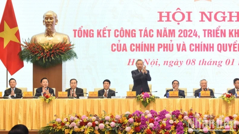 Sau khi nghe tham luận của lãnh đạo các bộ, ngành, địa phương, phát biểu ý kiến chỉ đạo Hội nghị, thay mặt Bộ Chính trị, Ban Bí thư, lãnh đạo Đảng và Nhà nước, Tổng Bí thư Tô Lâm nhiệt liệt hoan nghênh, ghi nhận, chúc mừng, biểu dương, Chính phủ, Thủ tướng Chính phủ, các cấp uỷ đảng, chính quyền, đoàn thể, cộng đồng doanh nghiệp, cán bộ, đảng viên, đồng bào, chiến sĩ cả nước và kiều bào ta ở nước ngoài về những nỗ lực phấn đấu và những kết quả, thành tích đã đạt được trong năm 2024, tạo nền tảng, động lực mới, khí thế mới, tâm thế mới cho việc thực hiện mục tiêu, nhiệm vụ của năm 2025 và Kế hoạch 5 năm 2021-2025, tạo đà cho mục tiêu hoàn thành toàn diện, vượt mức các chỉ tiêu, kế hoạch mà Đại Hội Đảng lần thứ XIII đã đề ra, đặc biệt là mục tiêu 100 năm thành lập Đảng và 100 năm thành lập nước.