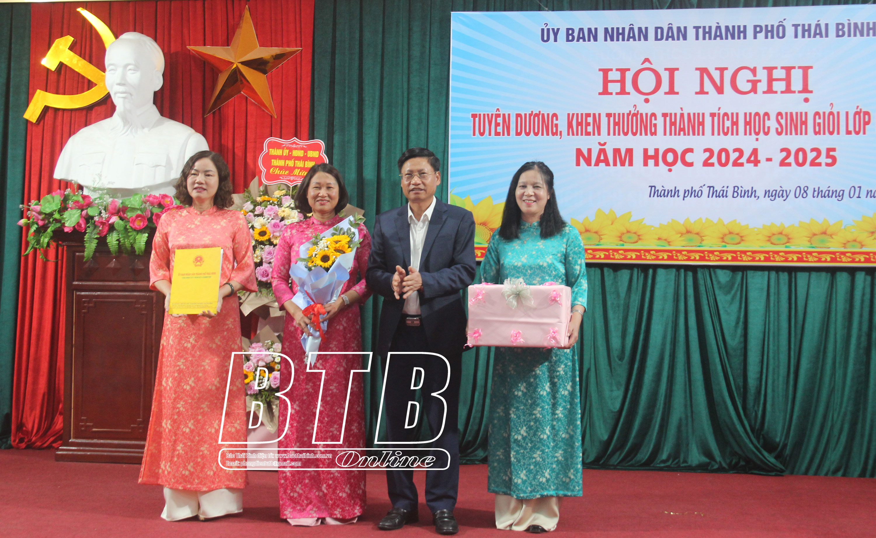 Tại hội nghị, UBND thành phố đã tuyên dương, khen thưởng 1 tập thể, 7 giáo viên và 13 học sinh đạt thành tích cao trong kỳ thi chọn học sinh giỏi lớp 9 cấp tỉnh năm học 2024 - 2025.