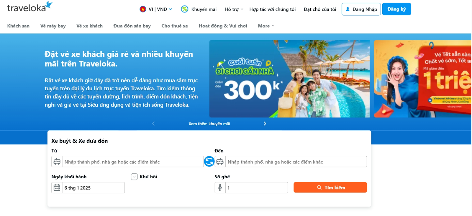 Traveloka là nền tảng đặt vé trực tuyến hàng đầu Đông Nam Á, cung cấp đa dạng dịch vụ du lịch, trong đó có đặt vé máy bay, khách sạn và đặt vé xe khách. Giao diện thân thiện, dễ dùng cùng hệ thống tìm kiếm thông minh giúp bạn đặt vé xe Tết nhanh chóng và tiện lợi. Traveloka cam kết đem đến trải nghiệm đặt vé đơn giản, đáng tin cậy, giúp bạn tiết kiệm thời gian và công sức chuẩn bị cho kỳ nghỉ Tết trọn vẹn.