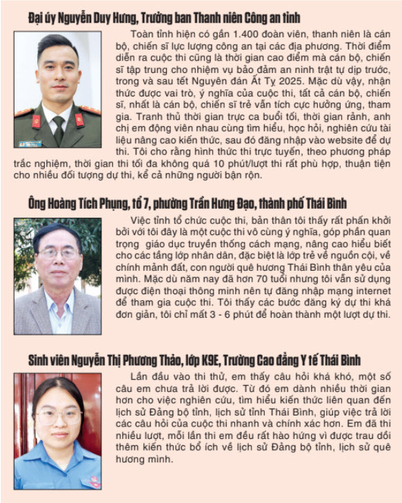 Ngay sau khi phát động, cuộc thi trắc nghiệm trên internet tìm hiểu “Lịch sử Đảng bộ, lịch sử tỉnh Thái Bình” đã lan tỏa sâu rộng, thu hút sự tham gia của đông đảo cán bộ, đảng viên và các tầng lớp nhân dân. Tham dự cuộc thi giúp cán bộ, đảng viên và các tầng lớp nhân dân có cơ hội tìm hiểu về lịch sử hình thành, quá trình xây dựng và phát triển Đảng bộ tỉnh, lịch sử mảnh đất, con người Thái Bình. Qua cuộc thi góp phần giáo dục truyền thống cách mạng, khơi dậy lòng tự hào, ý thức trách nhiệm của mỗi người, từ đó đoàn kết, thi đua, cống hiến, đóng góp công sức, trí tuệ xây dựng quê hương Thái Bình ngày càng giàu đẹp, văn minh, sớm trở thành tỉnh phát triển trong khu vực đồng bằng sông Hồng.