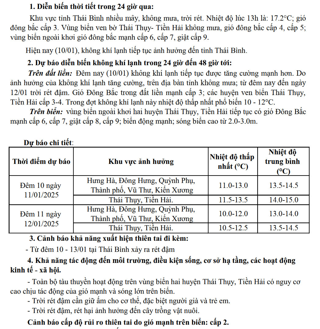 Tin không khí lạnh tăng cường và rét tỉnh Thái Bình