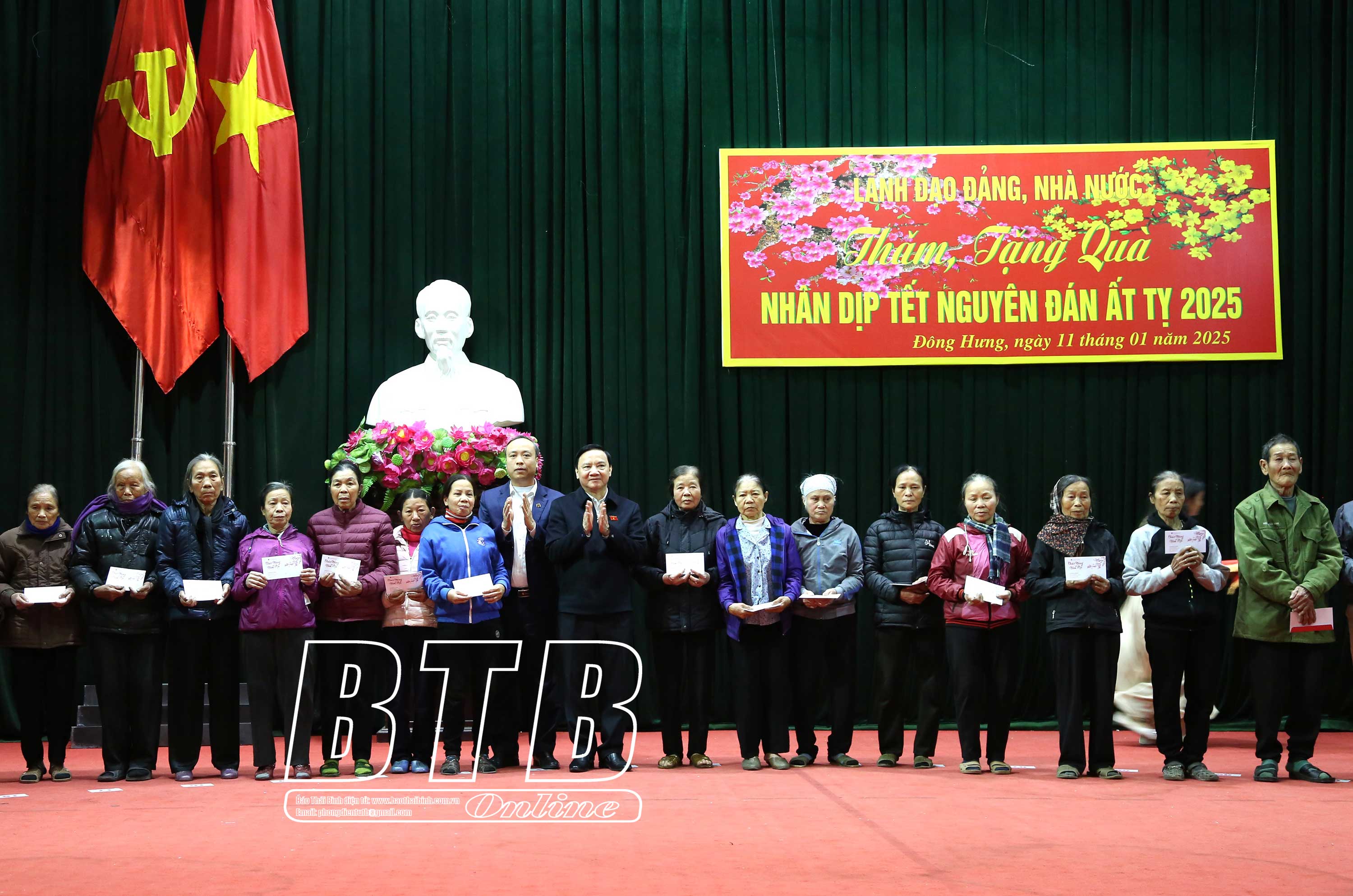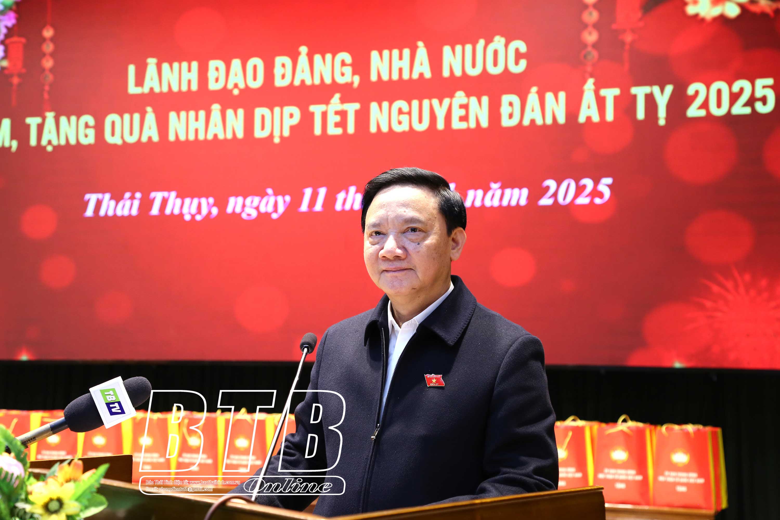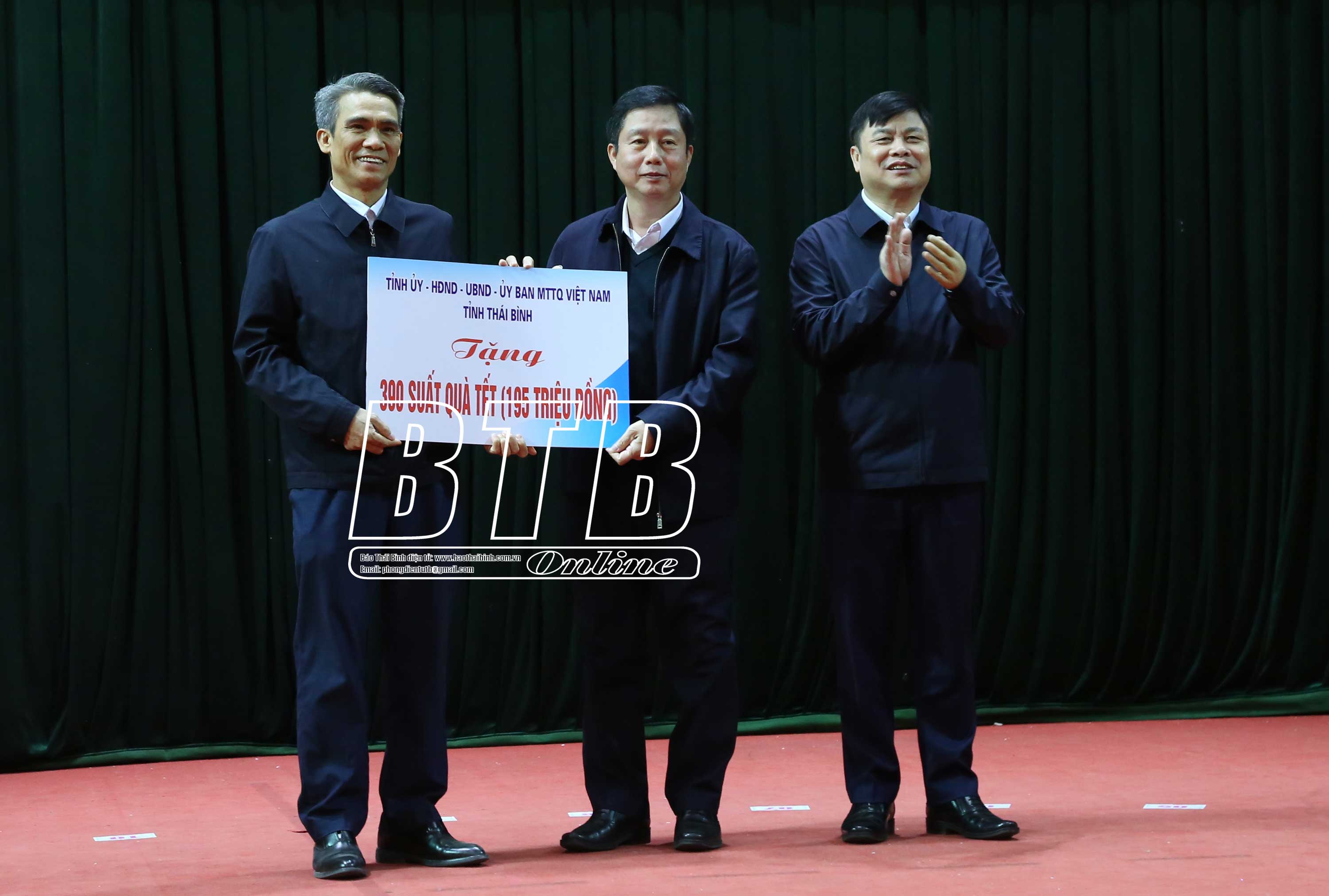 Đồng chí khẳng định: Đảng, Nhà nước luôn quan tâm, chăm lo đến cuộc sống của người dân, đặc biệt là những người nghèo, người có hoàn cảnh khó khăn, các đối tượng chính sách, những người yếu thế. Tỉnh Thái Bình nói chung, huyện Thái Thụy nói riêng đã rất quan tâm, dành ngân sách, đồng thời vận động các nhà hảo tâm, các doanh nghiệp để chăm lo tết cho người dân, bảo đảm tất cả các hộ nghèo, hộ cận nghèo, gia đình chính sách, công nhân có hoàn cảnh khó khăn đều có quà tết.