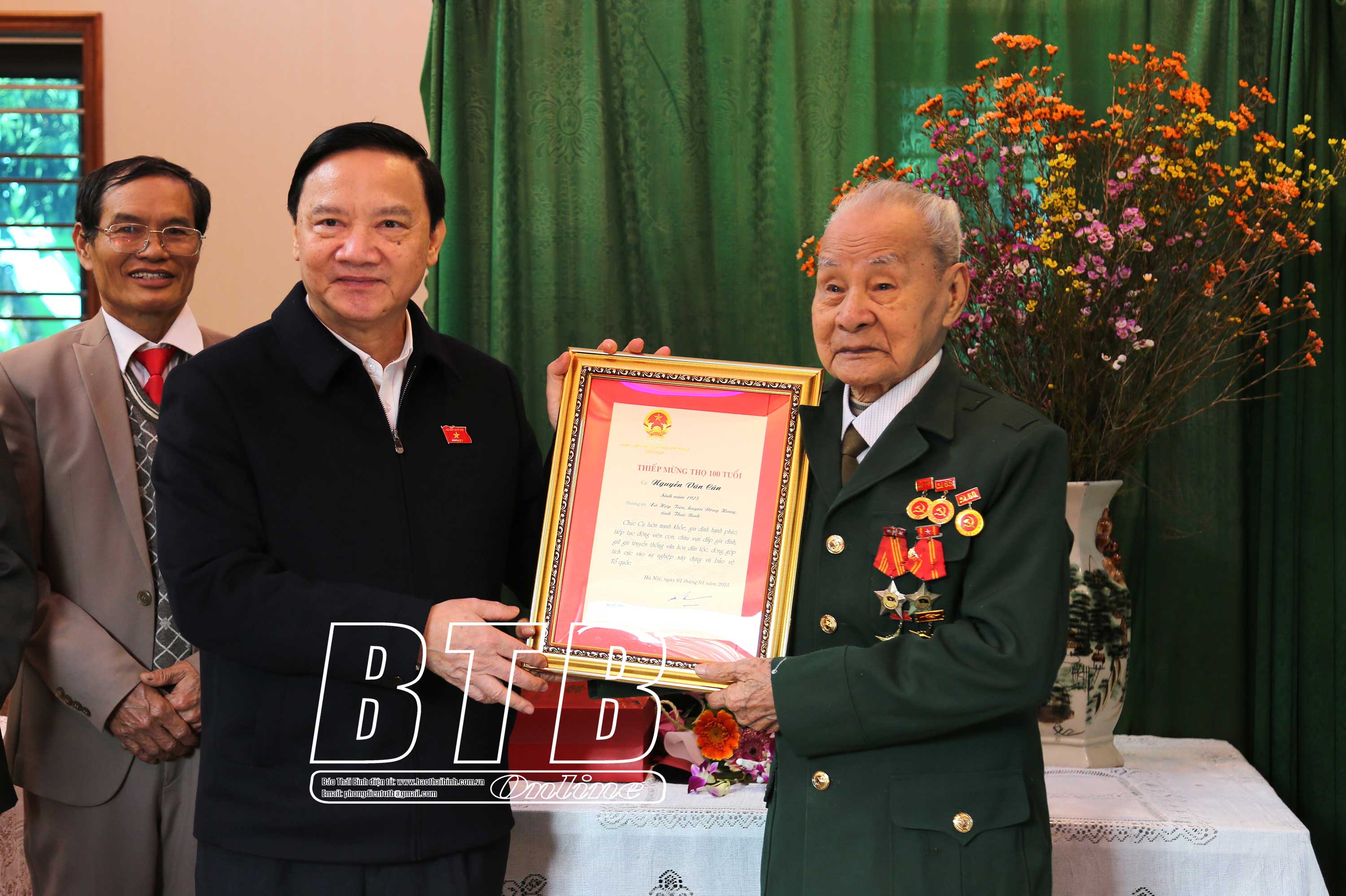 Đồng chí Nguyễn Khắc Định, Ủy viên Ban Chấp hành Trung ương Đảng, Phó Chủ tịch Quốc hội tặng quà tết, trao thiệp chúc thọ 100 tuổi tới ông Hoàng Minh Cân, xã Phong Dương Tiến (Đông Hưng).
